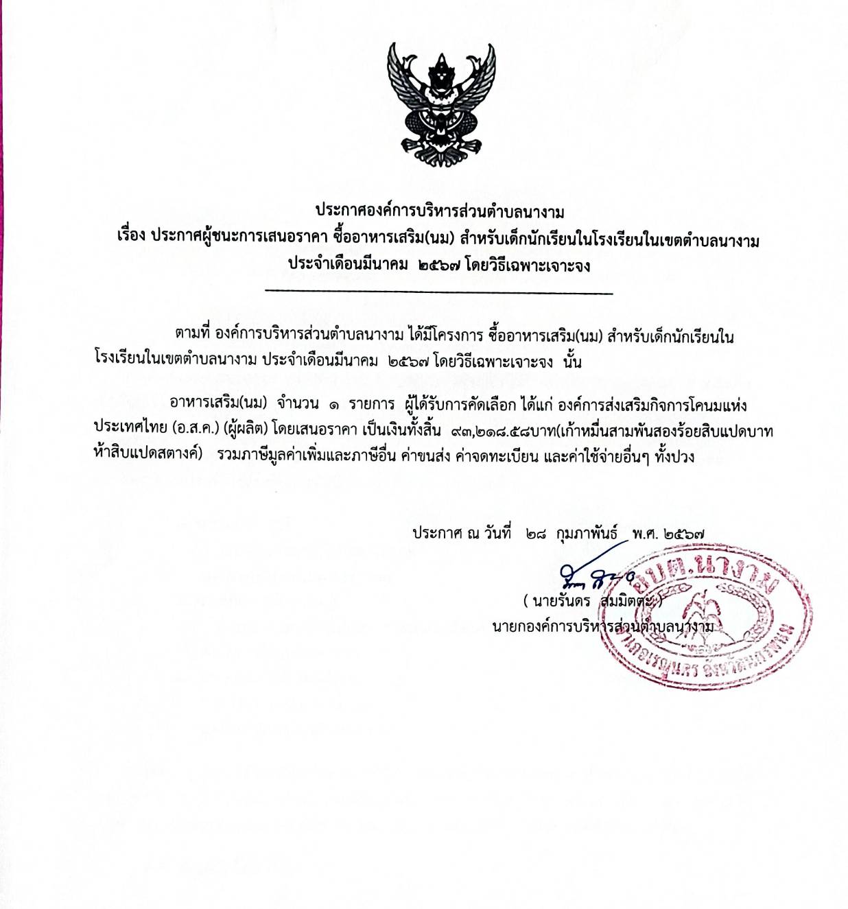 ประกาศผู้ชนะการเสนอราคา ซื้ออาหารเสริม(นม) สำหรับเด็กนักเรียนในโรงเรียนในเขตตำบลนางาม ประจำเดือนมีนาคม ๒๕๖๗ โดยวิธีเฉพาะเจาะจง