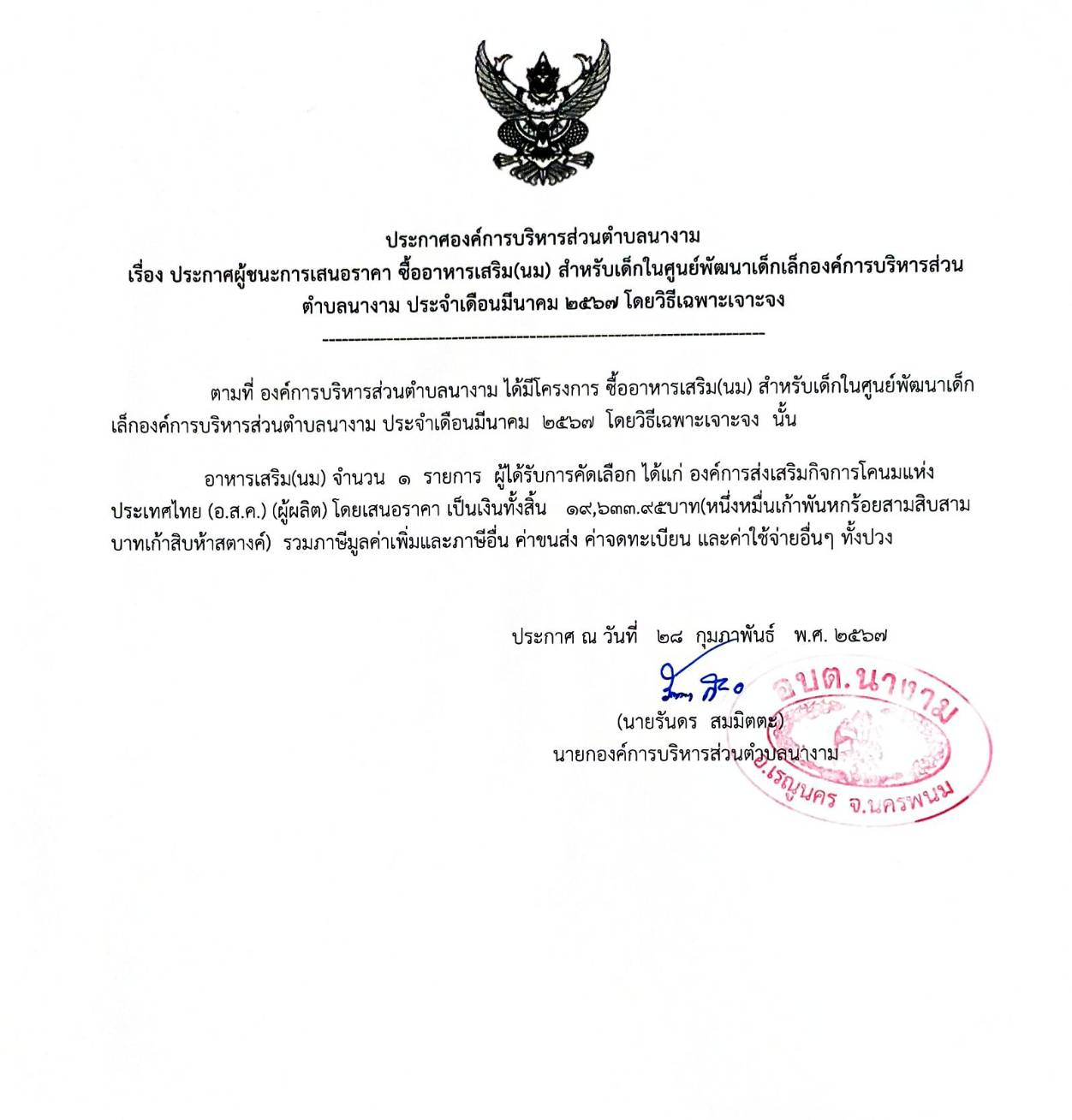 ประกาศผู้ชนะการเสนอราคา ซื้ออาหารเสริม(นม) สำหรับเด็กในศูนย์พัฒนาเด็กเล็กองค์การบริหารส่วนตำบลนางาม ประจำเดือนมีนาคม ๒๕๖๗ โดยวิธีเฉพาะเจาะจง