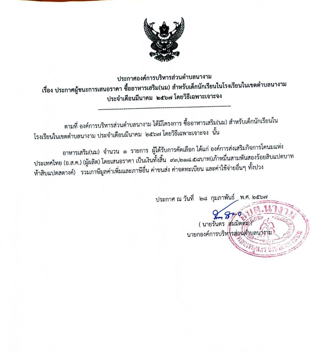 ประกาศผู้ชนะการเสนอราคา ซื้ออาหารเสริม(นม) สำหรับเด็กนักเรียนในโรงเรียนในเขตตำบลนางาม ประจำเดือนมีนาคม ๒๕๖๗ โดยวิธีเฉพาะเจาะจง