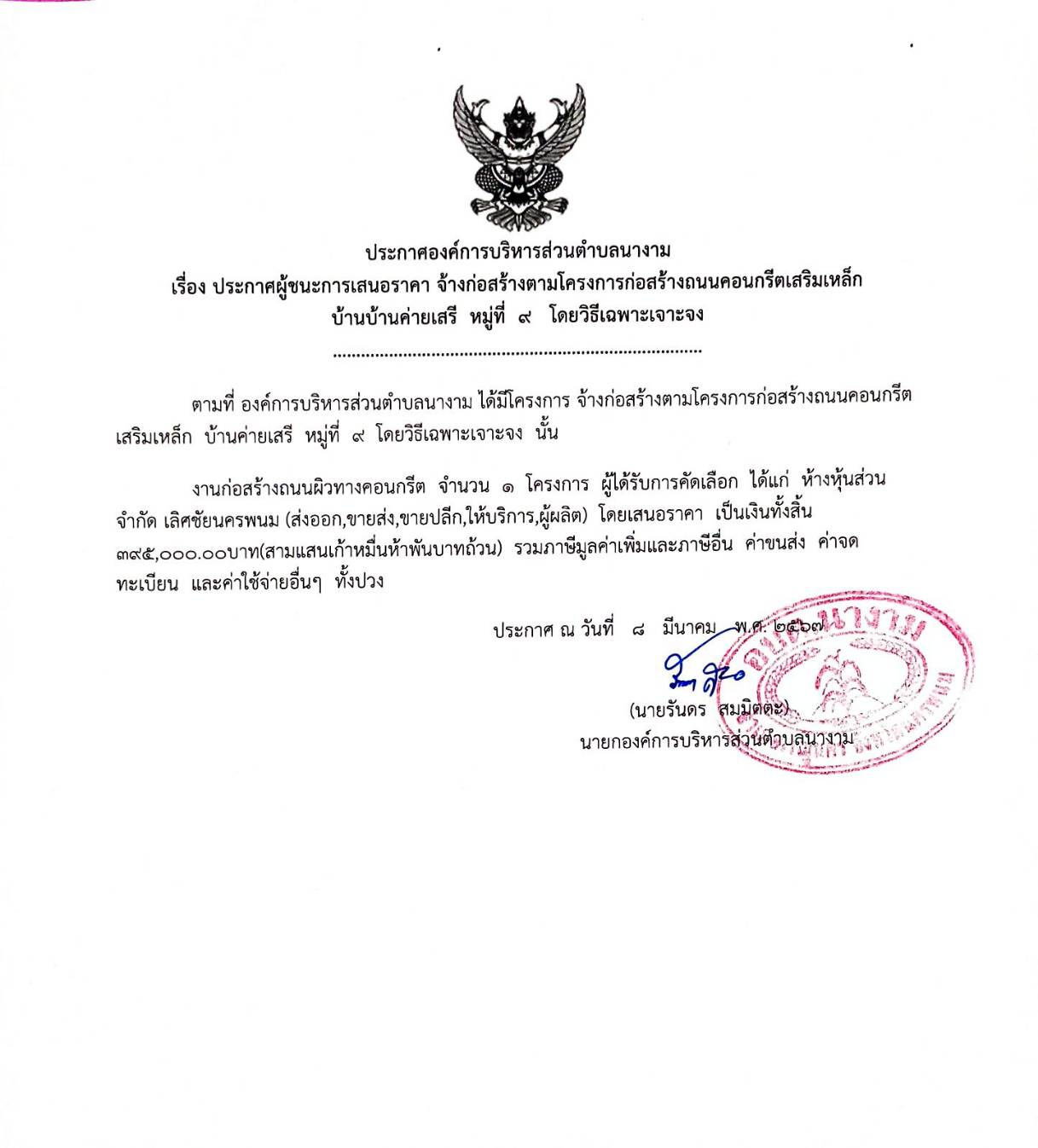 ประกาศผู้ชนะการเสนอราคา จ้างก่อสร้างตามโครงการก่อสร้างถนนคอนกรีตเสริมเหล็ก บ้านค่ายเสรี หมู่ที่ ๙ โดยวิธีเฉพาะเจาะจง