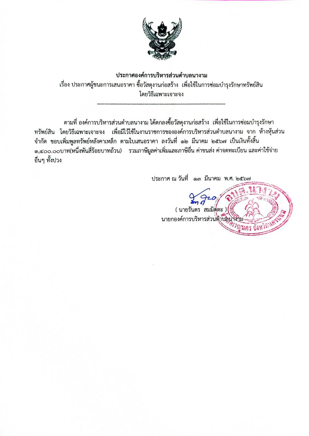 ประกาศผู้ชนะราคาการเสนอราคา ซื้อวัสดุงานก่อสร้าง เพื่อใช้ในการซ่อมบำรุงรักษาทรัพย์สิน โดยวิธีเฉพาะเจาะจง