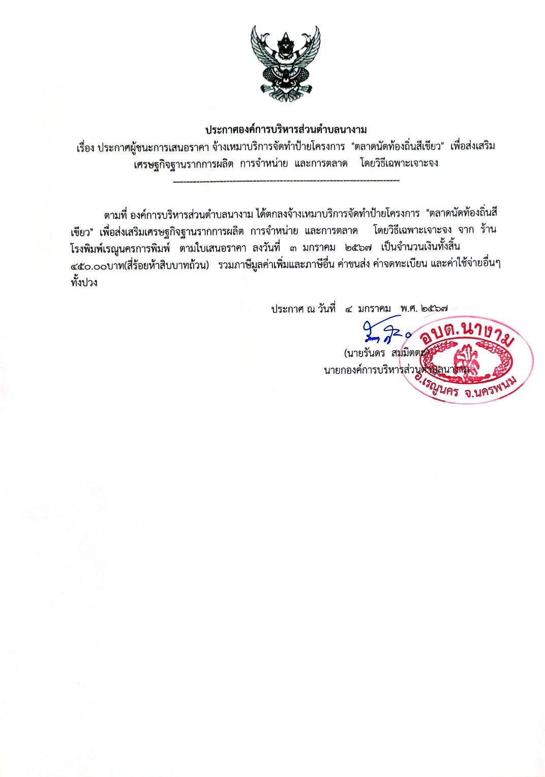 ชื่อเรื่อง : ประกาศผู้ชนะการเสนอราคา จ้างเหมาบริการจัดทำป้ายโครงการ "ตลาดนัดท้องถิ่นสีเขียว" เพื่อส่งเสริมเศรษฐกิจฐานรากการผลิต การจำหน่าย และการตลาด โดยวิธีเฉพาะเจาะจง