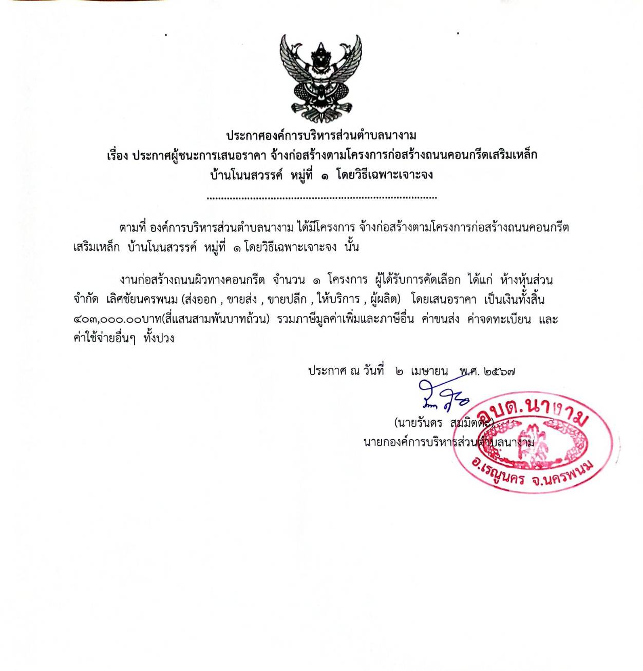 ชื่อเรื่อง : ประกาศผู้ชนะการเสนอราคา จ้างก่อสร้างตามโครงการก่อสร้างถนนคอนกรีตเสริมเหล็ก บ้านโนนสวรรค์ หมู่ที่ ๑ โดยวิธีเฉพาะเจาะจง
