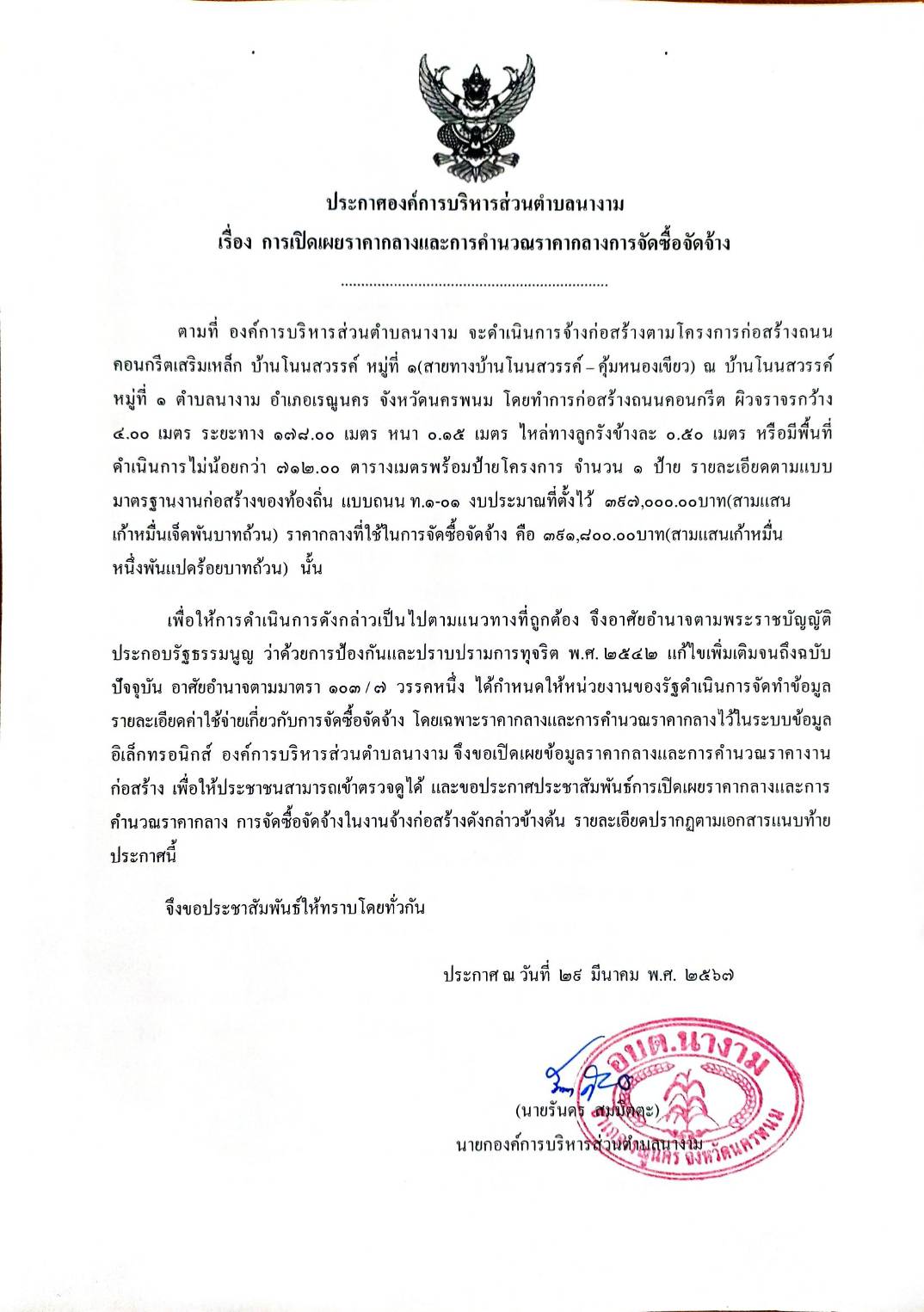 ประชาสัมพันธ์การเปิดเผยราคากลางตามโครงการก่อสร้างถนนคอนกรีตเสริมเหล็ก บ้านโนนสวรรค์ หมู่ที่ 1(สายทางบ้านโนนสวรรค์ - คุ้มหนองเขียว)