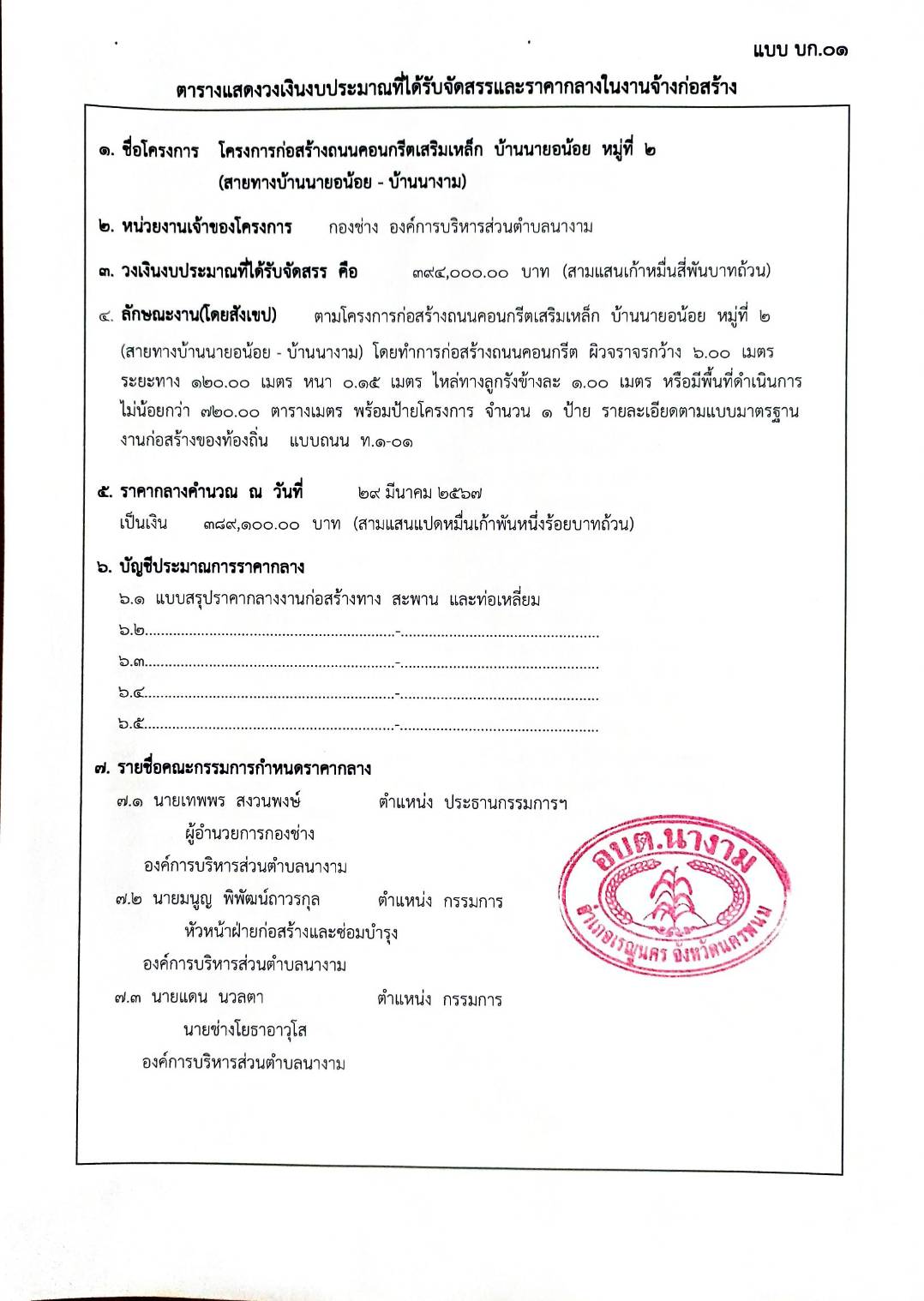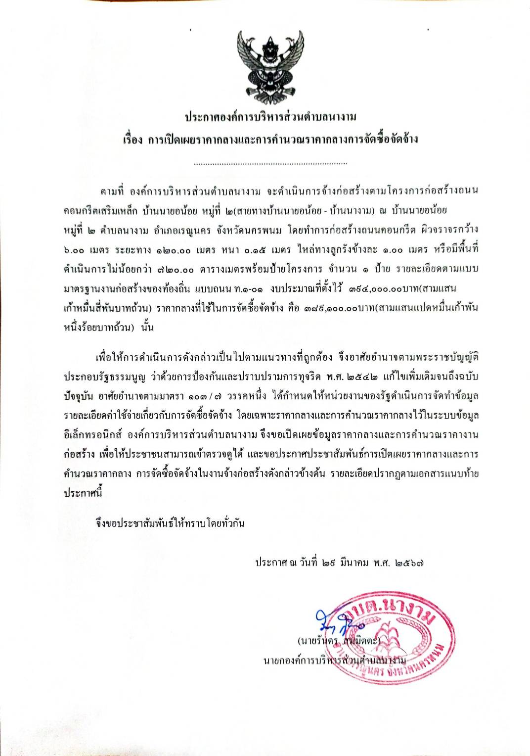 ประชาสัมพันธ์การเปิดเผยราคากลางตามโครงการก่อสร้างถนนคอนกรีตเสริมเหล็ก บ้านนายอน้อย หมู่ที่ 2(สายทางบ้านนายอน้อย - บ้านนางาม)