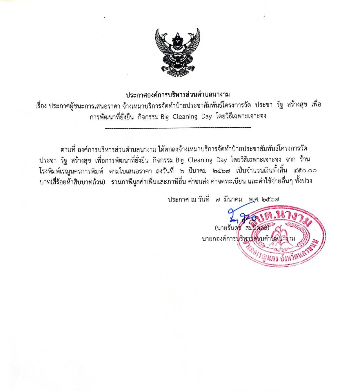 ประกาศผู้ชนะการเสนอราคา จ้างเหมาบริการจัดทำป้ายประชาสัมพันธ์โครงการวัด ประชา รัฐ สร้างสุข เพื่อการพัฒนาที่ยั่งยืน กิจกรรม Big Cleaning Day โดยวิธีเฉพาะเจาะจง