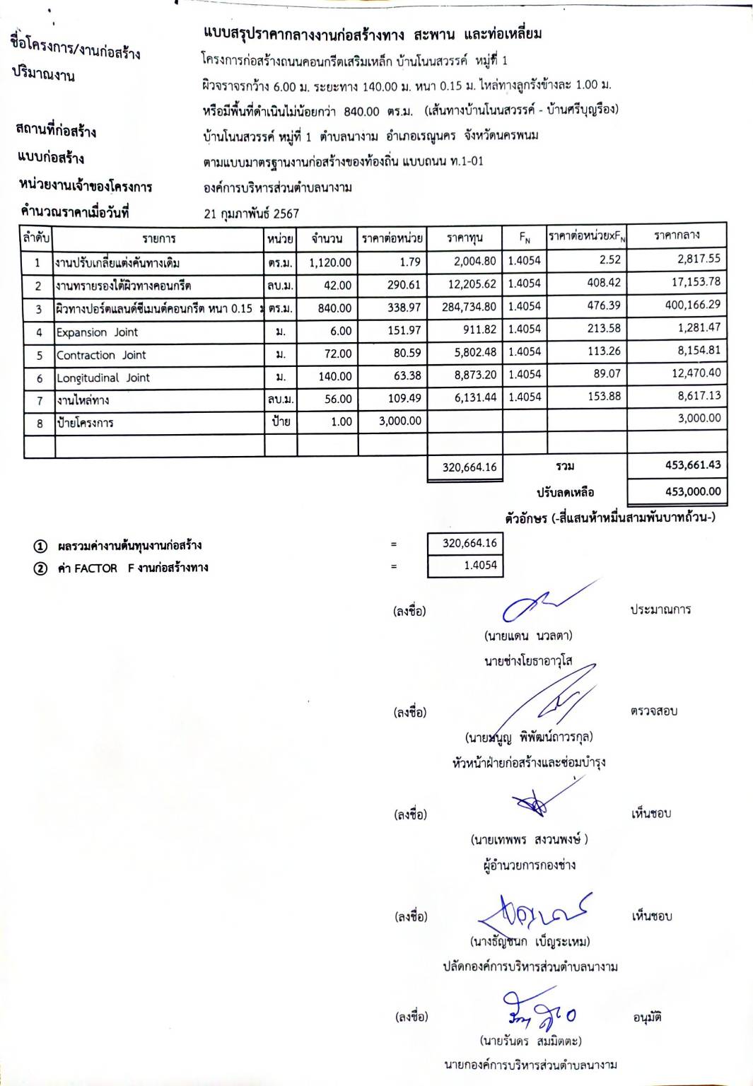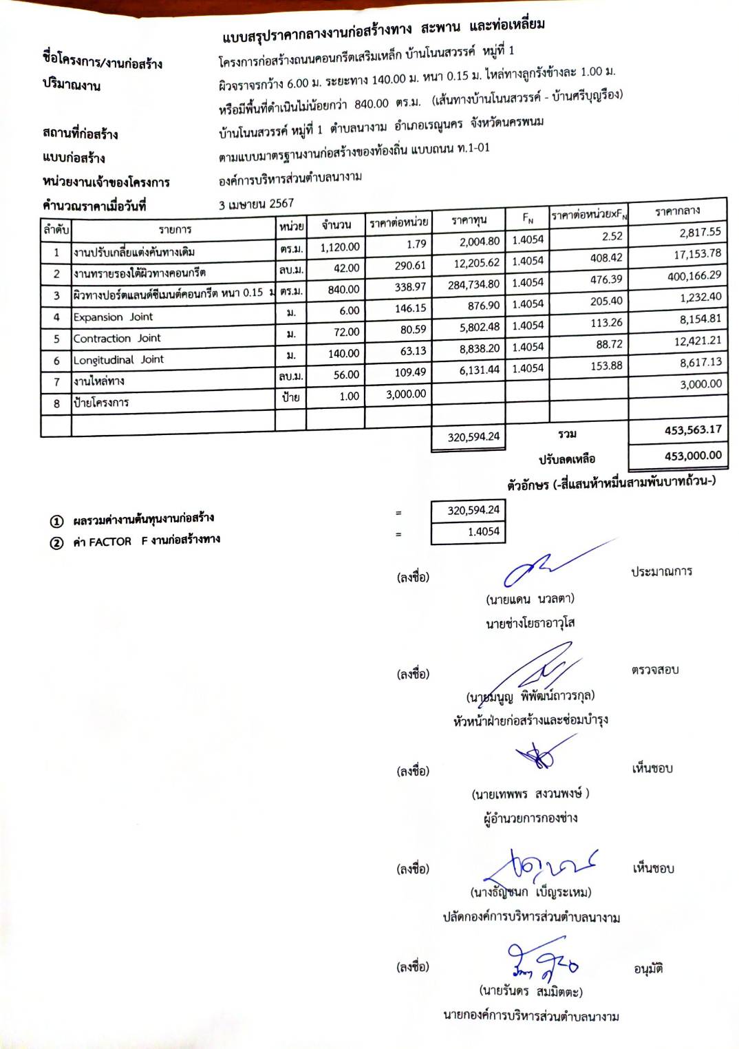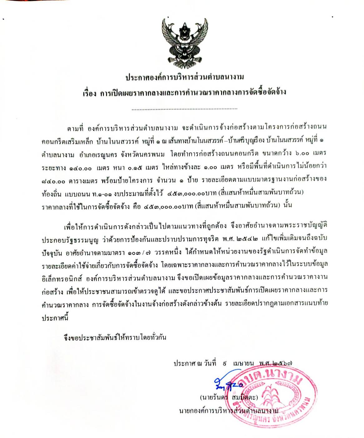 ประชาสัมพันธ์การเปิดเผยราคากลางตามโครงการก่อสร้างถนนคอนกรีตเสริมเหล็ก บ้านโนนสวรรค์ หมู่ที่ ๑
