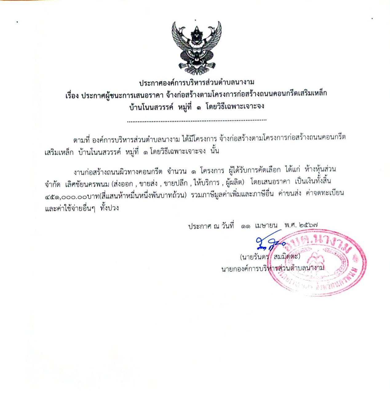 ประกาศผู้ชนะการเสนอราคา จ้างก่อสร้างตามโครงการก่อสร้างถนนคนกรีตเสริมเหล็ก บ้านโนนสวรรค์ หมู่ที่ ๑ โดยวิธีเฉพาะเจาะจง