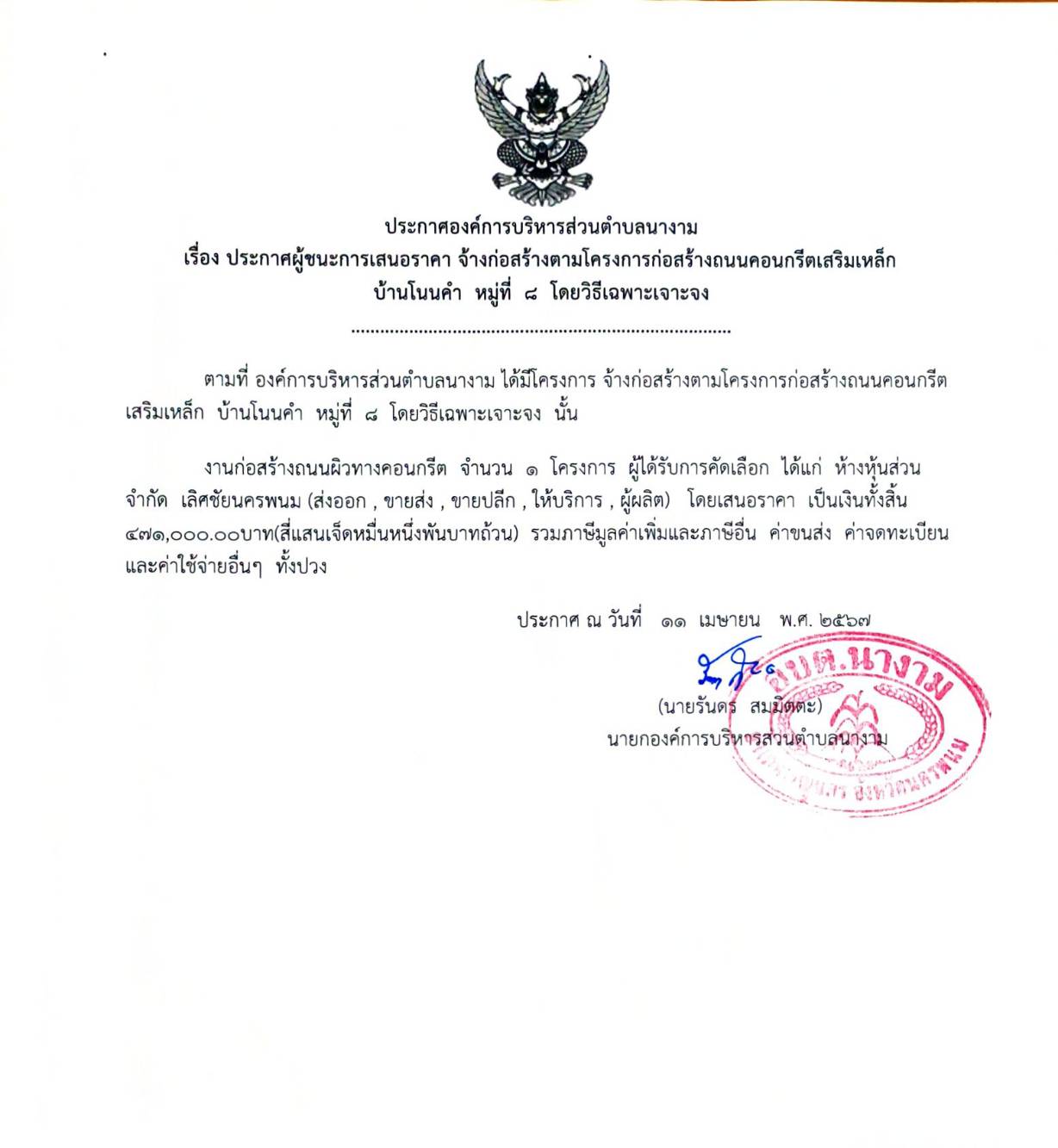 ประกาศผู้ชนะการเสนอราคา จ้างก่อสร้างตามโครงการก่อสร้างถนนคนกรีตเสริมเหล็ก บ้านโนนคำ หมู่ที่ ๘ โดยวิธีเฉพาะเจาะจง