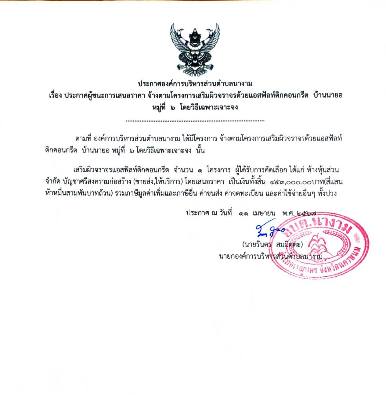 ประกาศผู้ชนะการเสนอราคา จ้างก่อสร้างตามโครงการเสริมผิวจราจรด้วยแอสฟัลท์ติกคอนกรีต บ้านนายอ หมู่ที่ ๖ โดยวิธีเฉพาะเจาะจง