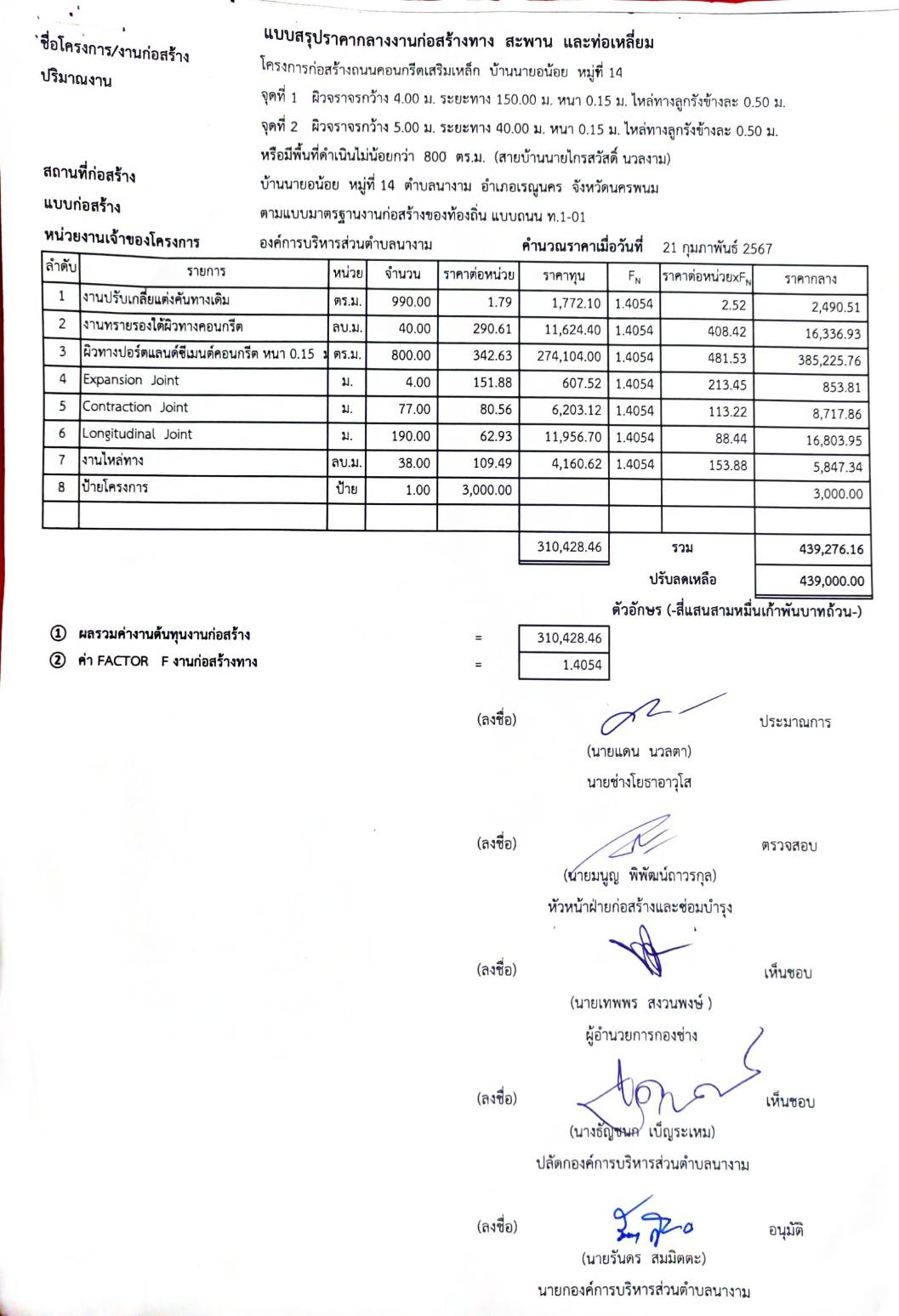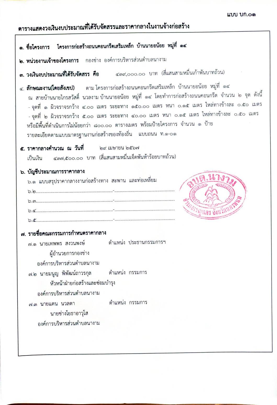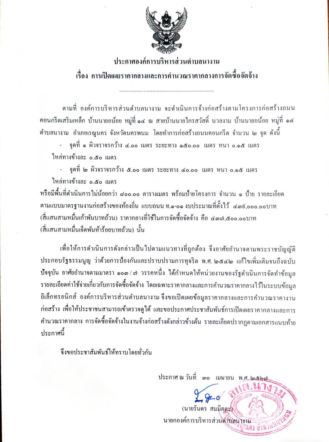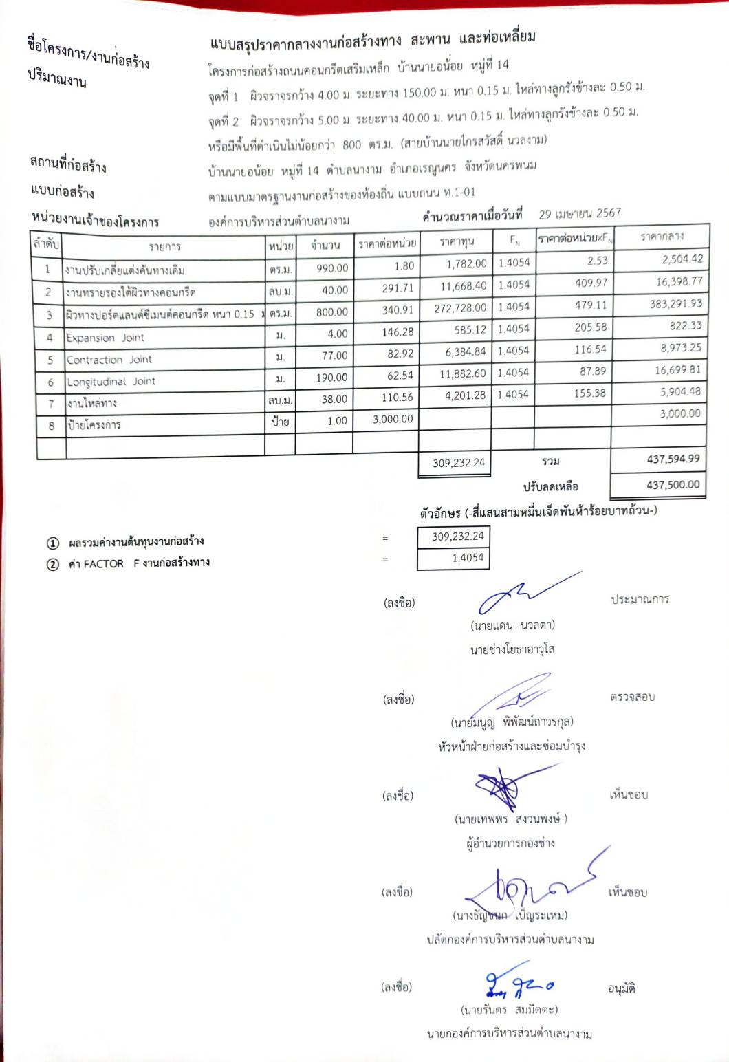 ประชาสัมพันธ์การเปิดเผยราคากลางตามโครงการก่อสร้างถนนคอนกรีตเสริมเหล็ก บ้านนายอน้อย หมู่ที่ ๑๔
