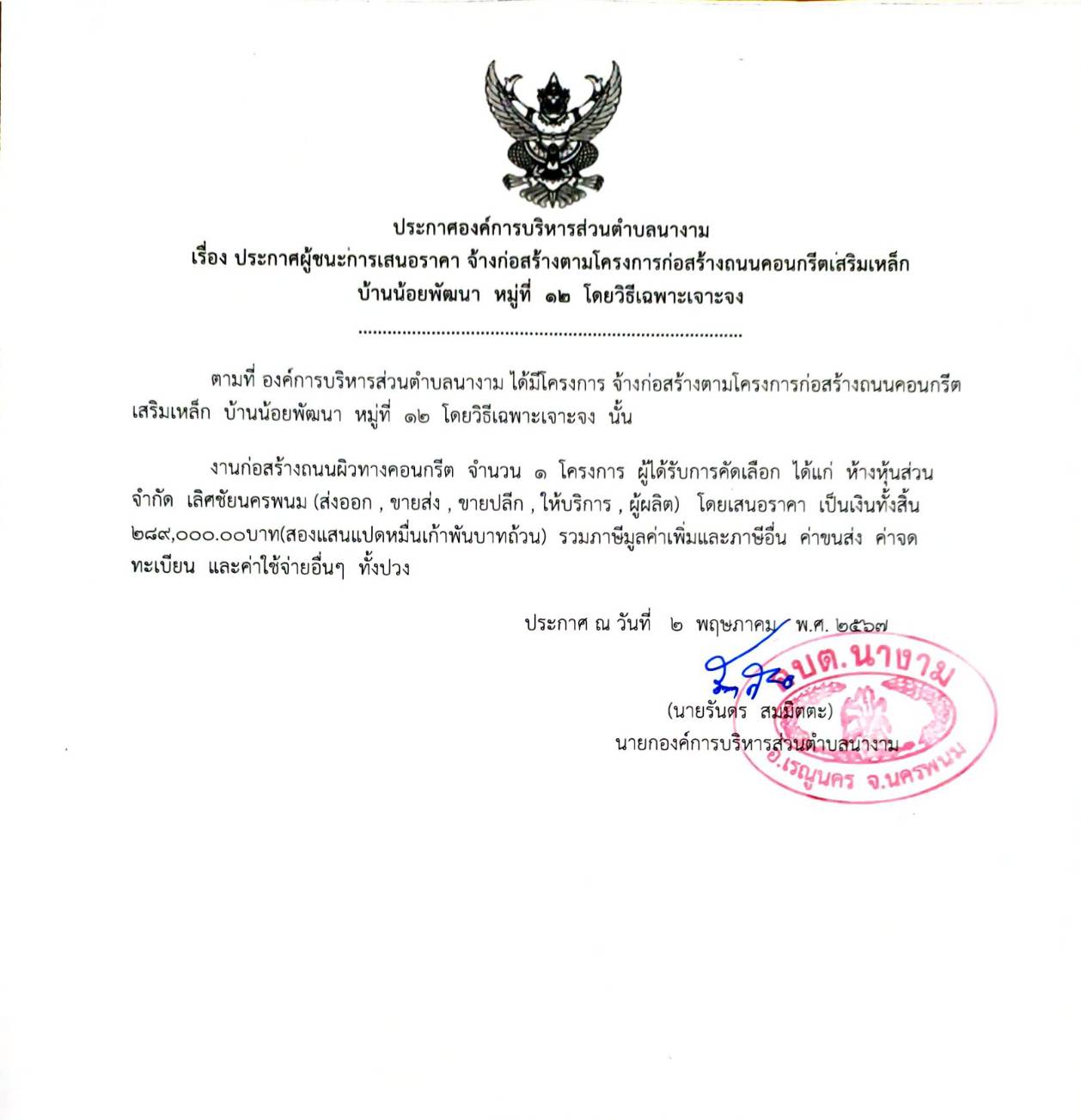 ประกาศผู้ชนะการเสนอราคา จ้างก่อสร้างตามโครงการก่อสร้างถนนคนกรีตเสริมเหล็ก บ้านน้อยพัฒนา หมู่ที่ ๑๒ โดยวิธีเฉพาะเจาะจง