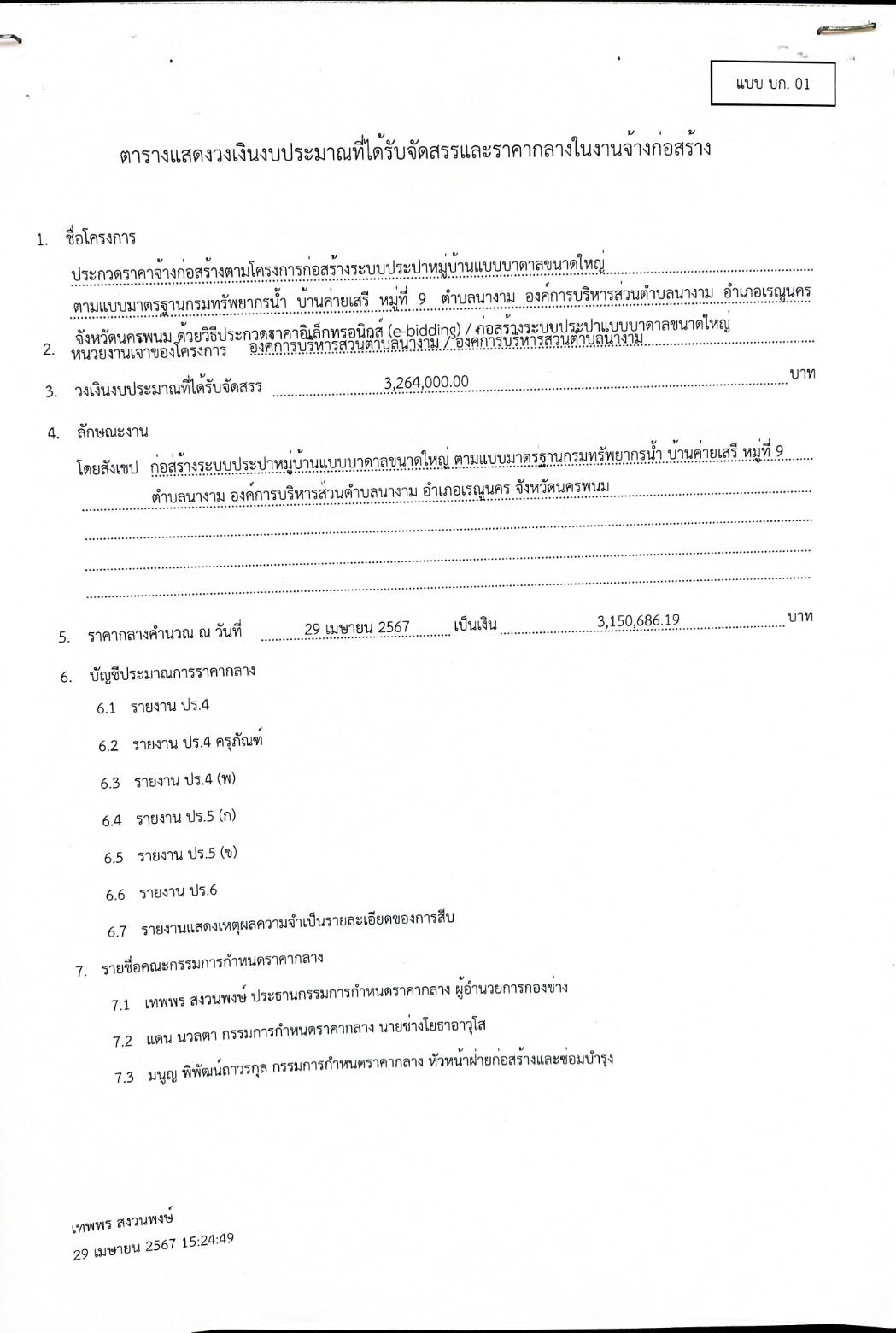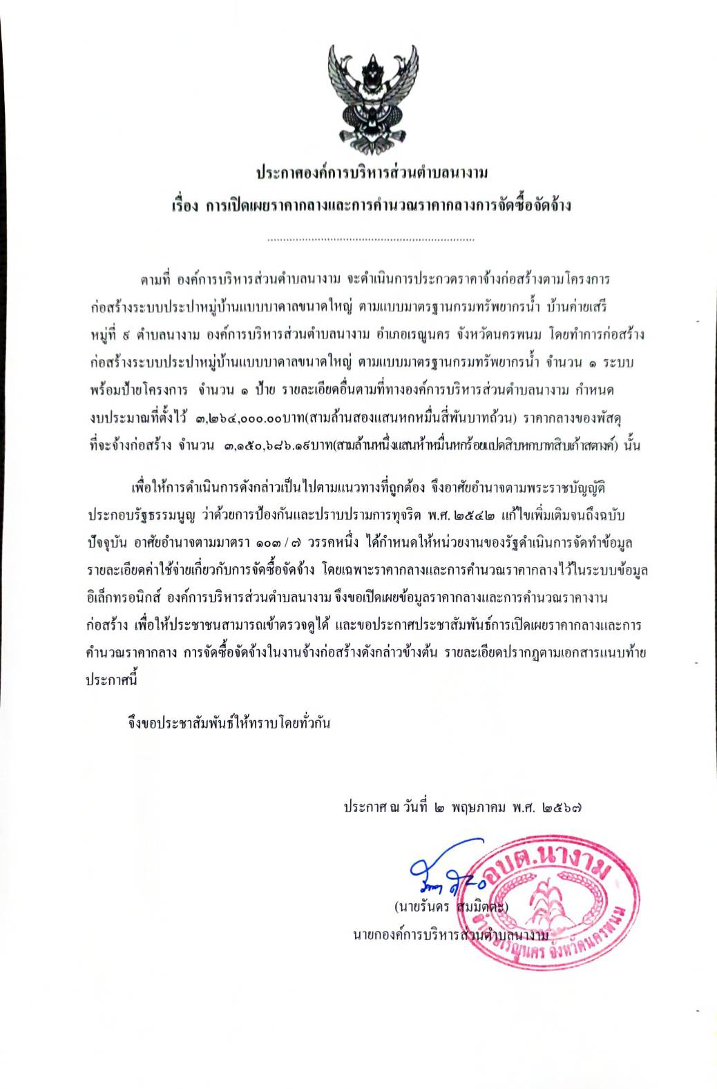 ชื่อเรื่อง : ประชาสัมพันธ์การเปิดเผยราคากลางตาม โครงการ ประกวดราคาจ้างก่อสร้างตามโครงการก่อสร้างระบบประปาหมู่บ้านแบบบาดาลขนาดใหญ่ ตามแบบมาตรฐานกรมทรัพยากรน้ำ บ้านค่ายเสรี หมู่ที่ 9 ตำบลนางาม องค์การบริหารส่วนตำบลนางาม อำเภอเรณูนคร จังหวัดนครพนม ด้วยวิธีประกวดราคาอิเล็กทรอนิกส์ (e-bidding)