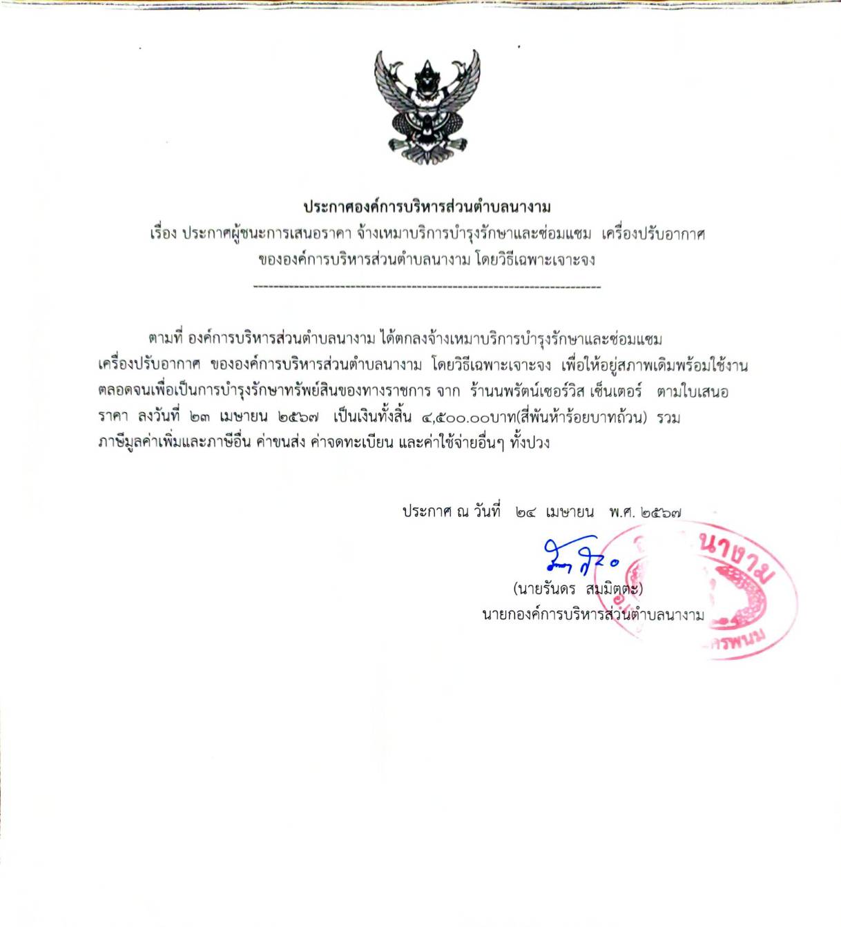 ประกาศผู้ชนะการเสนอราคา จ้างเหมาบริการบำรุงรักษาและซ่อมแซม เครื่องปรับอากาศ ขององค์การบริหารส่วนตำบลนางาม โดยวิธีเฉพาะเจาะจง