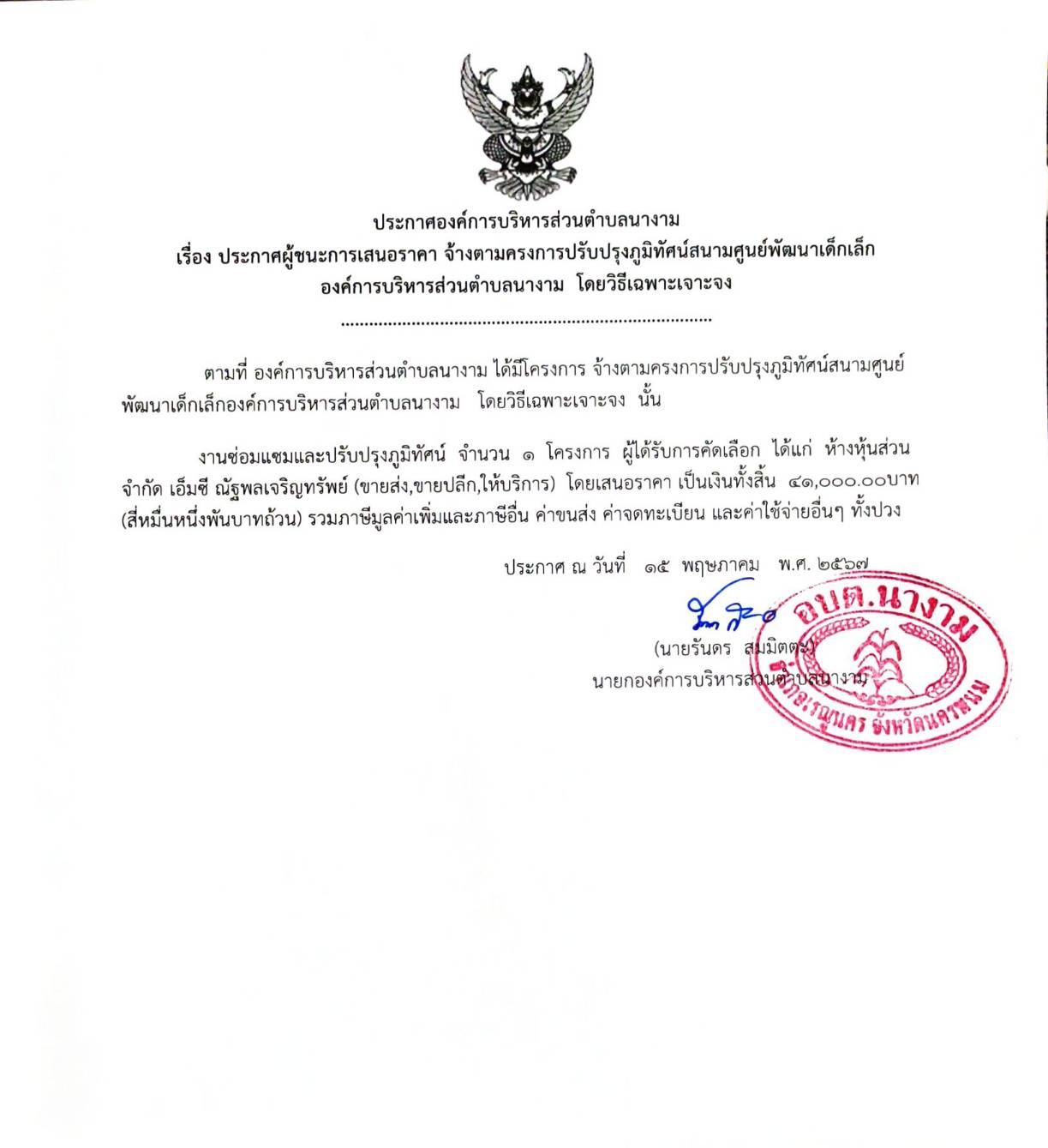 ประกาศผู้ชนะการเสนอราคา จ้างตามโครงการปรับปรุงภูมิทัศน์สนามศูนย์พัฒนาเด็กเล็ก องค์การบริหารส่วนตำบลนางาม โดยวิธีเฉพาะเจาะจง