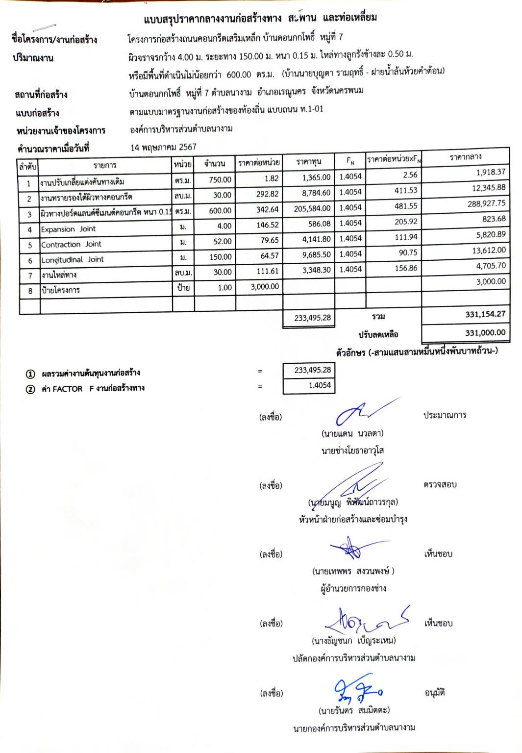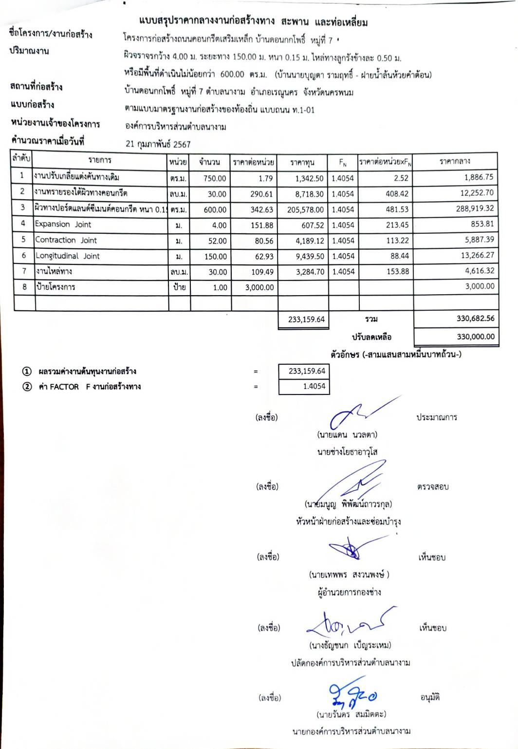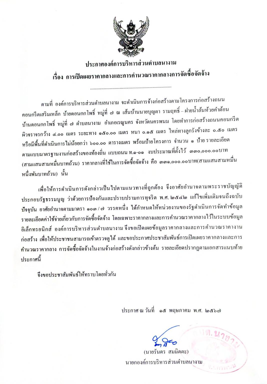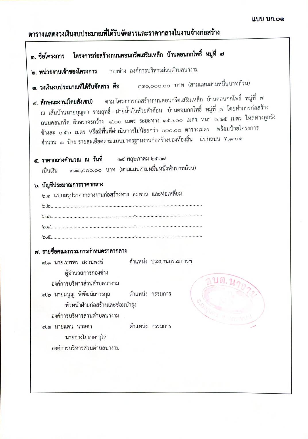 ประชาสัมพันธ์การเปิดเผยราคากลางตามโครงการก่อสร้างถนนคอนกรีตเสริมเหล็ก บ้านดอนกกโพธิ์ หมู่ที่ ๗