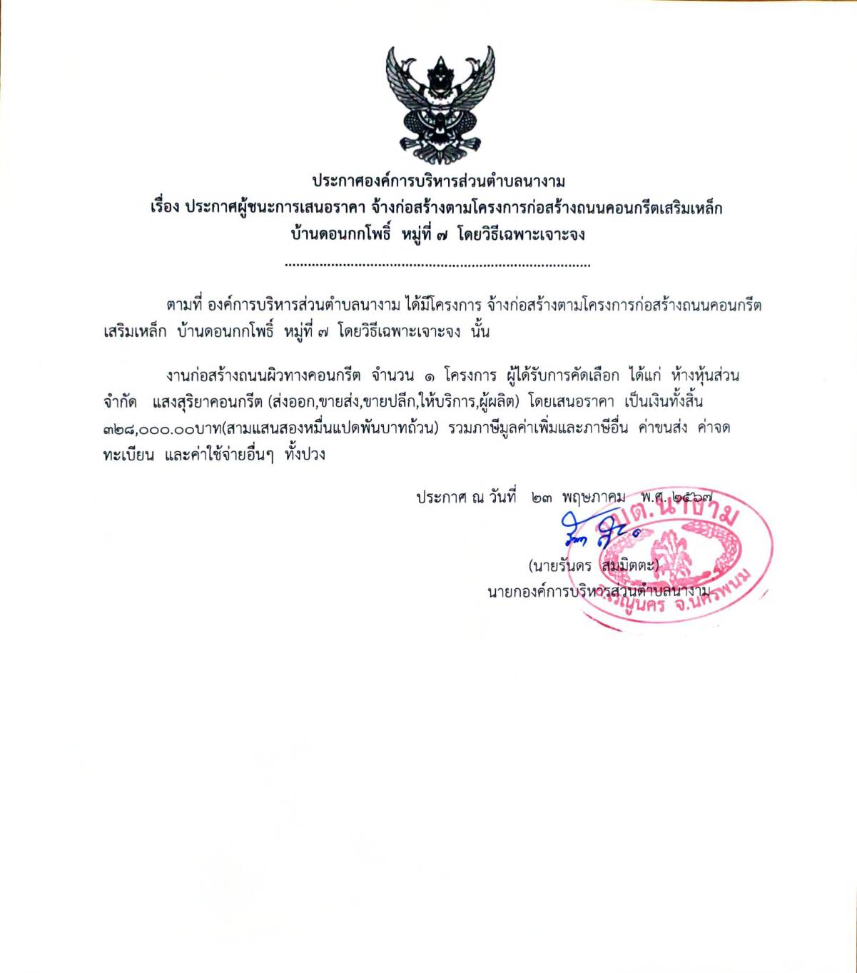 ประกาศผู้ชนะการเสนอราคา จ้างตามโครงการก่อสร้างถนนคอนกรีตเสริมเหล็ก บ้านดอนกกโพธิ์ หมู่ที่ ๗ โดยวิธีเฉพาะเจาะจง
