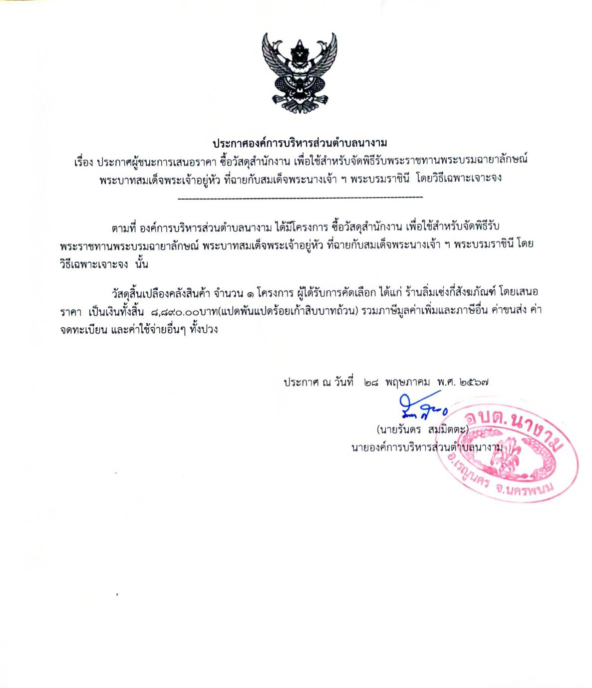 ชื่อเรื่อง : ประกาศผู้ชนะการเสนอราคา ซื้อวัสดุสำนักงาน เพื่อใช้สำหรับจัดพิธีรับพระราชทานพระบรมฉายาลักษณ์ พระบาทสมเด็จพระเจ้าอยู่หัว ที่ฉายกับสมเด็จพระนางเจ้า ฯ พระบรมราชินี โดยวิธีเฉพาะเจาะจง