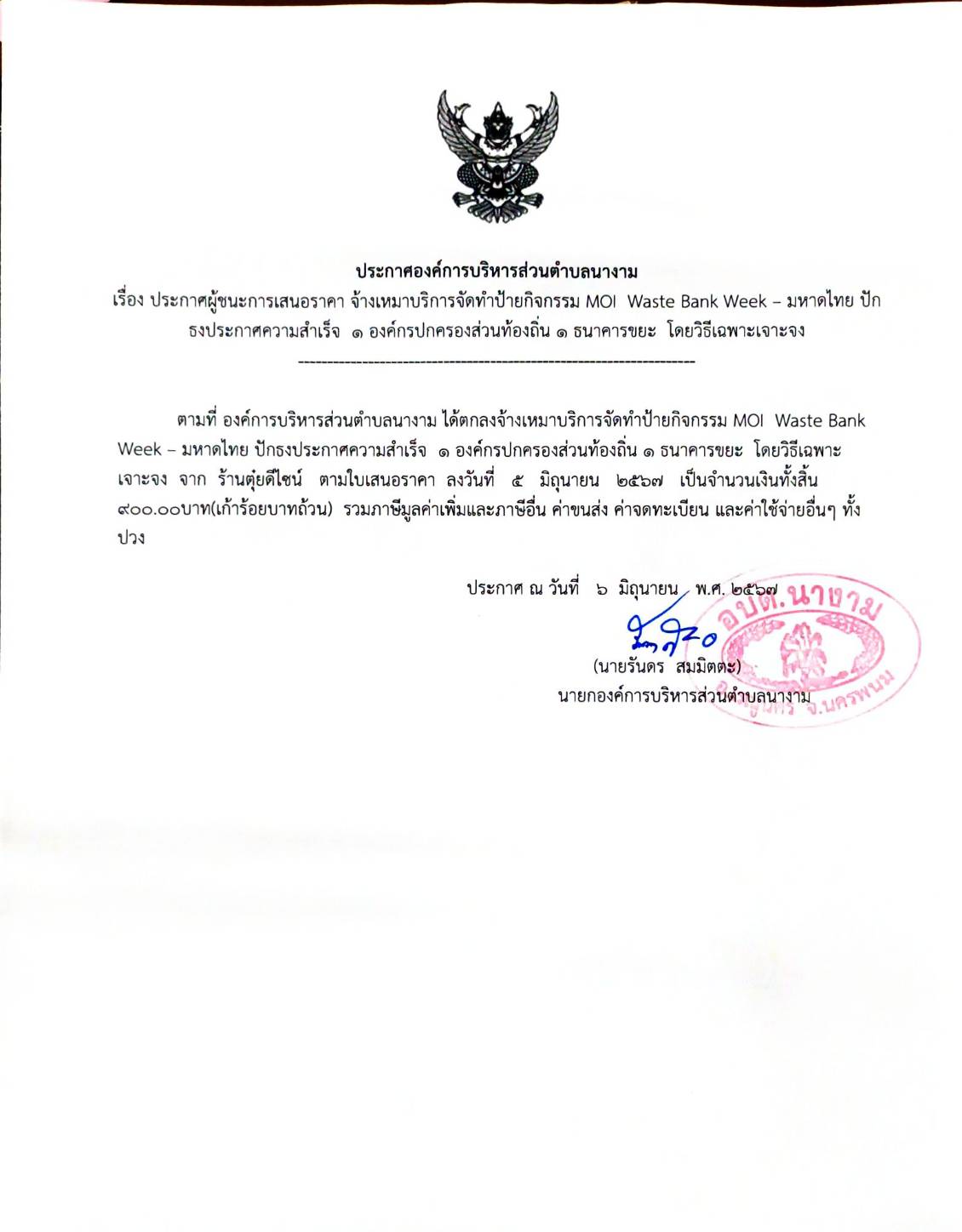ชื่อเรื่อง : ประกาศผู้ชนะการเสนอราคา จ้างเหมาบริการจัดทำป้ายกิจกรรม MOI Waste Week - มหาดไทย ปักะงประกาศความสำเร็จ ๑ องค์กรปกครองส่วนท้องถิ่น ๑ ธนาคารขยะ โดยวิธีเฉพาะเจาะจง