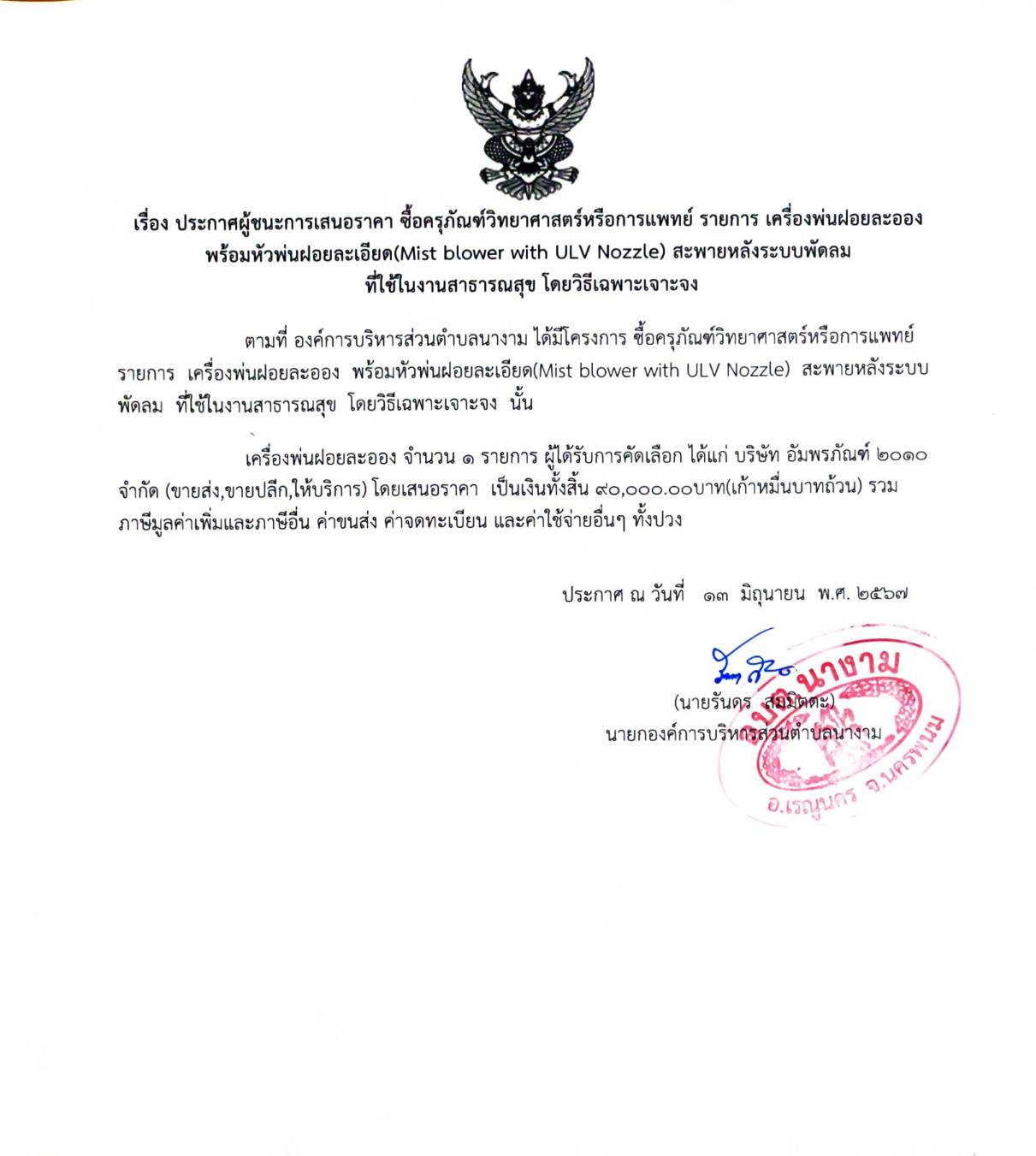 ชื่อเรื่อง : ประกาผู้ชนะการเสนอราคา ซื้อครุภัณฑ์วิทยาศาสตร์หรือการแพทย์ รายการ เครื่องพ่นฝอยละออง พร้อมหัวพ่นฝอยละเอียด(Mist blower with ULV Nozzle) สะพายหลังระบบพัดลม ที่ใช้ในงานสาธารณสุข โดยวิธีเฉพาะเจาะจง