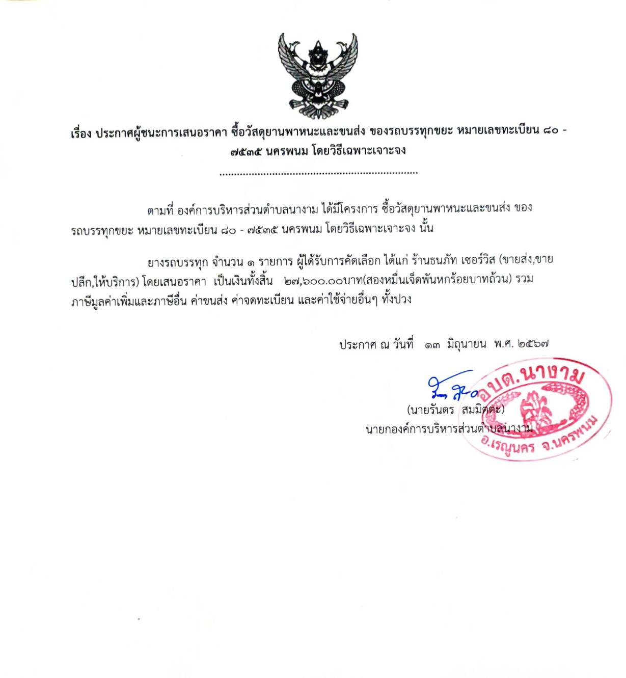 ประกาผู้ชนะการเสนอราคา ซื้อวัสดุยานพาหนะและขนส่ง ของรถบรรทุกขยะ หมายเลขทะเบียน ๘๐ - ๗๕๓๕ นครพนม โดยวิธีเฉพาะเจาะจง