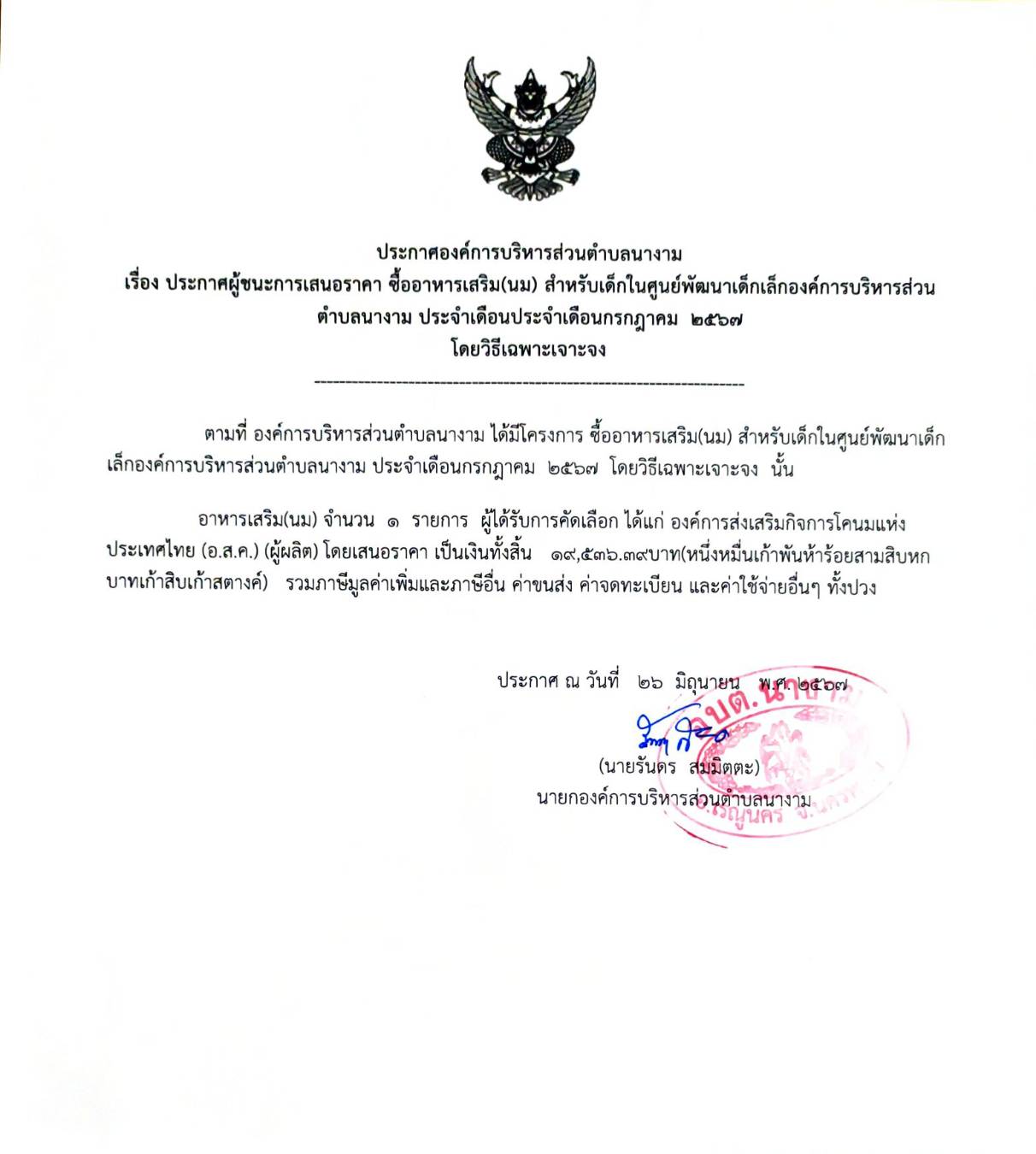 ประกาผู้ชนะการเสนอราคา ซื้ออาหารเสริม(นม) สำหรับเด็กในศูนย์พัฒนาเด็กเล็กองค์การบริหารส่วนตำบลนางาม ประจำเดือนกรกฎาคม ๒๕๖๗ โดยวิธีเฉพาะเจาะจง
