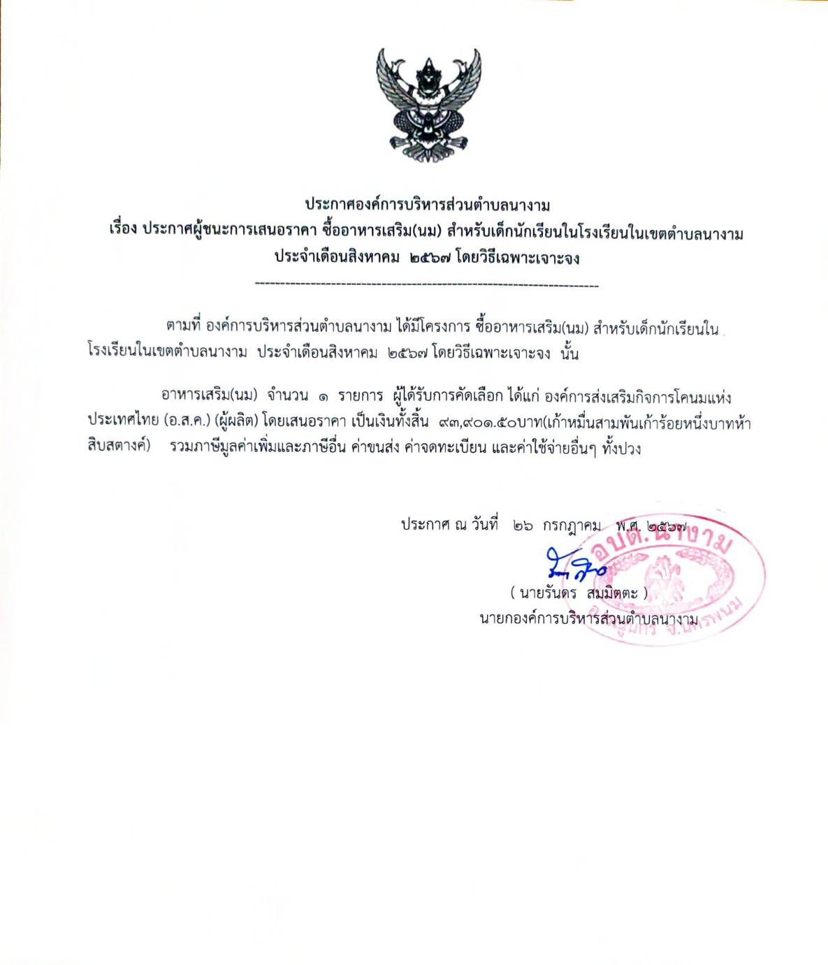 ประกาศผู้ชนะการเสนอราคา ซื้ออาหารเสริม(นม) สำหรับเด็กนักเรียนในโรงเรียนเขตตำบลนางาม ประจำเดือนสิงหาคม ๒๕๖๗ โดยวิธีเฉพาะเจาะจง