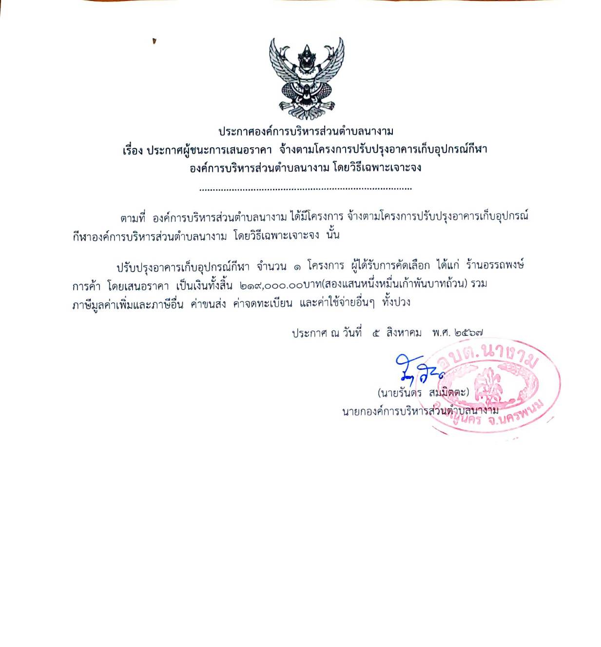 ประกาศผู้ชนะการเสนอราคา จ้างตามโครงการปรับปรุงอาคารเก็บอุปกรณ์กีฬาองค์การบริหารส่วนตำบลนางาม โดยวิธีเฉพาะเจาะจง โดยวิธีเฉพาะเจาะจง