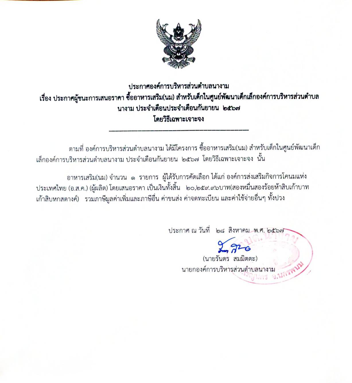 ประกาศผู้ชนะการเสนอราคา ซื้ออาหารเสริม(นม) สำหรับเด็กในศูนย์พัฒนาเด็กเล็กองค์การบริหารส่วนตำบลนางาม ประจำเดือนกันยายน ๒๕๖๗ โดยวิธีเฉพาะเจาะจง