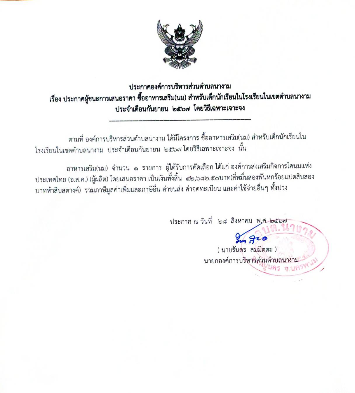 ประกาศผู้ชนะการเสนอราคา ซื้ออาหารเสริม(นม) สำหรับเด็กนักเรียนในโรงเรียนในเขตตำบลนางาม ประจำเดือนกันยายน ๒๕๖๗ โดยวิธีเฉพาะเจาะจง
