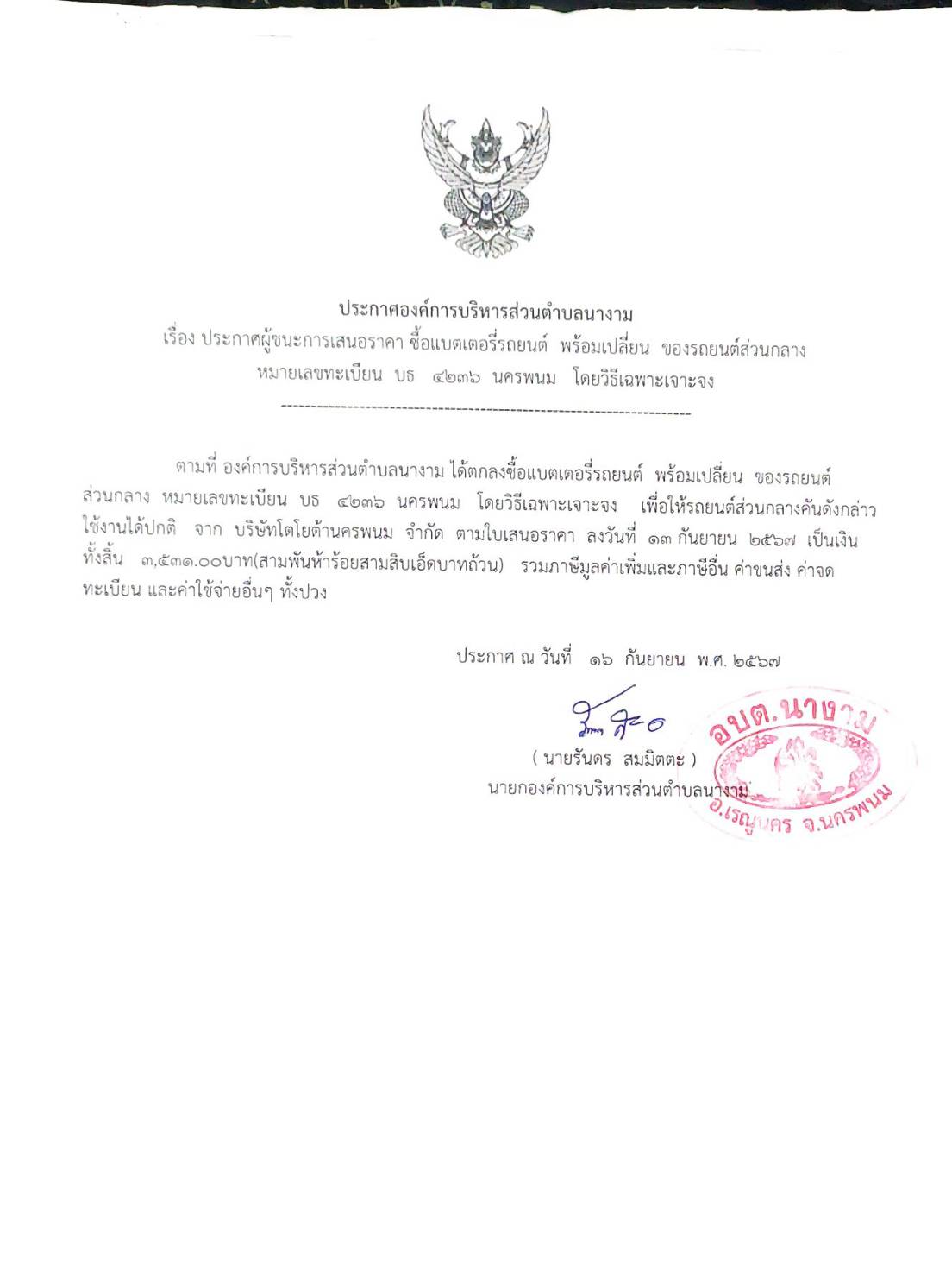 ประกาศผู้ชนะการเสนอราคา ซื้อแบตเตอรี่รถยนต์ พร้อมเปลี่ยน ของรถยนต์ส่วนกลาง หมายเลขทะเบียน บธ ๔๒๓๖ นครพนม โดยวิธีเฉพาะเจาะจง