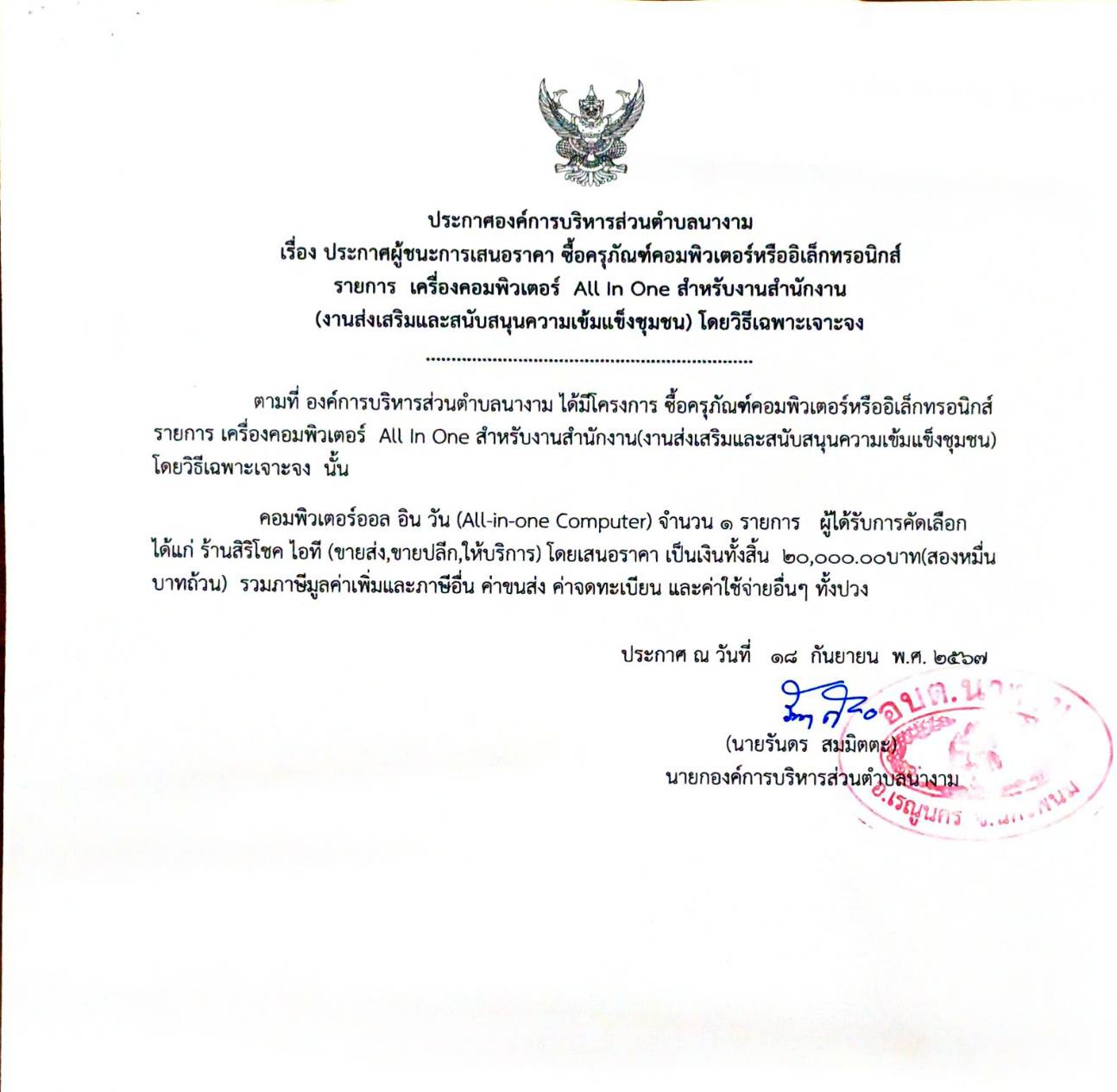 ชื่อเรื่อง : ประกาศผู้ชนะการเสนอราคา ซื้อครุภัณฑ์คอมพิวเตอร์หรืออิเล็กทรอนิกส์ รายการ เครื่องคอมพิวเตอร์ All In One สำหรับงานสำนักงาน(งานส่งเสริมและสนับสนุนความเข้มแข็งชุมชน) โดยวิธีเฉพาะเจาะจง