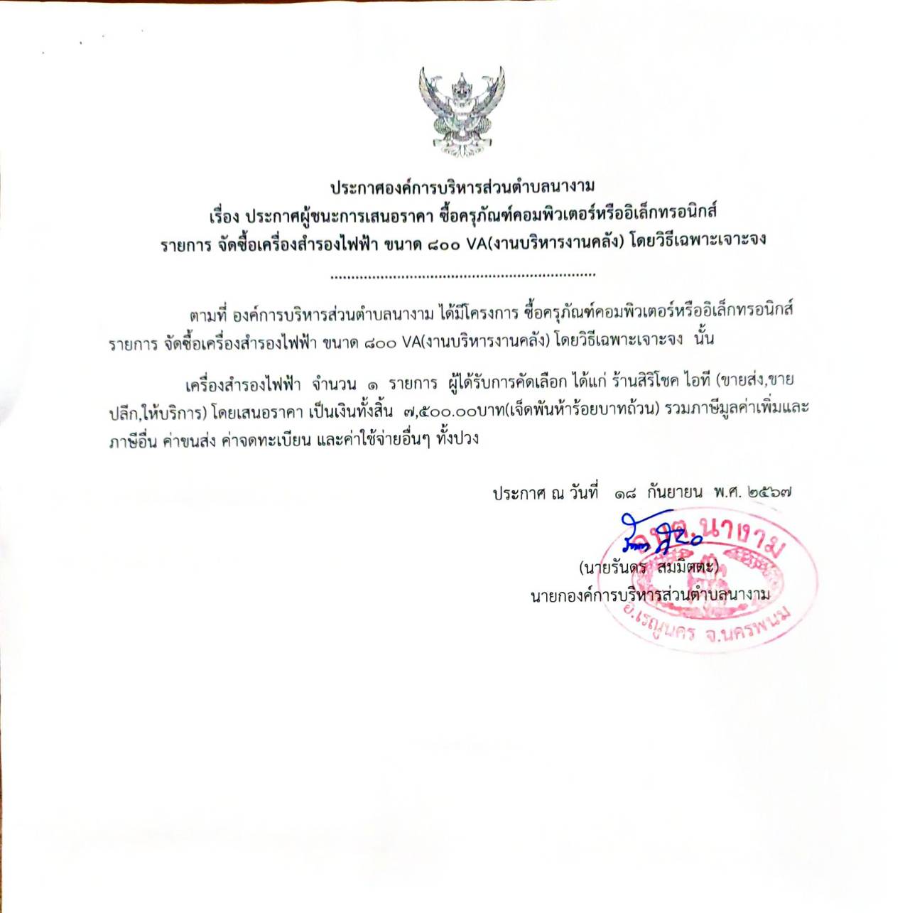 ประกาศผู้ชนะการเสนอราคา ซื้อครุภัณฑ์คอมพิวเตอร์หรืออิเล็กทรอนิกส์ รายการ จัดซื้อเครื่องสำรองไฟฟ้า ขนาด ๘๐๐ VA(งานบริหารงานคลัง) โดยวิธีเฉพาะเจาะจง