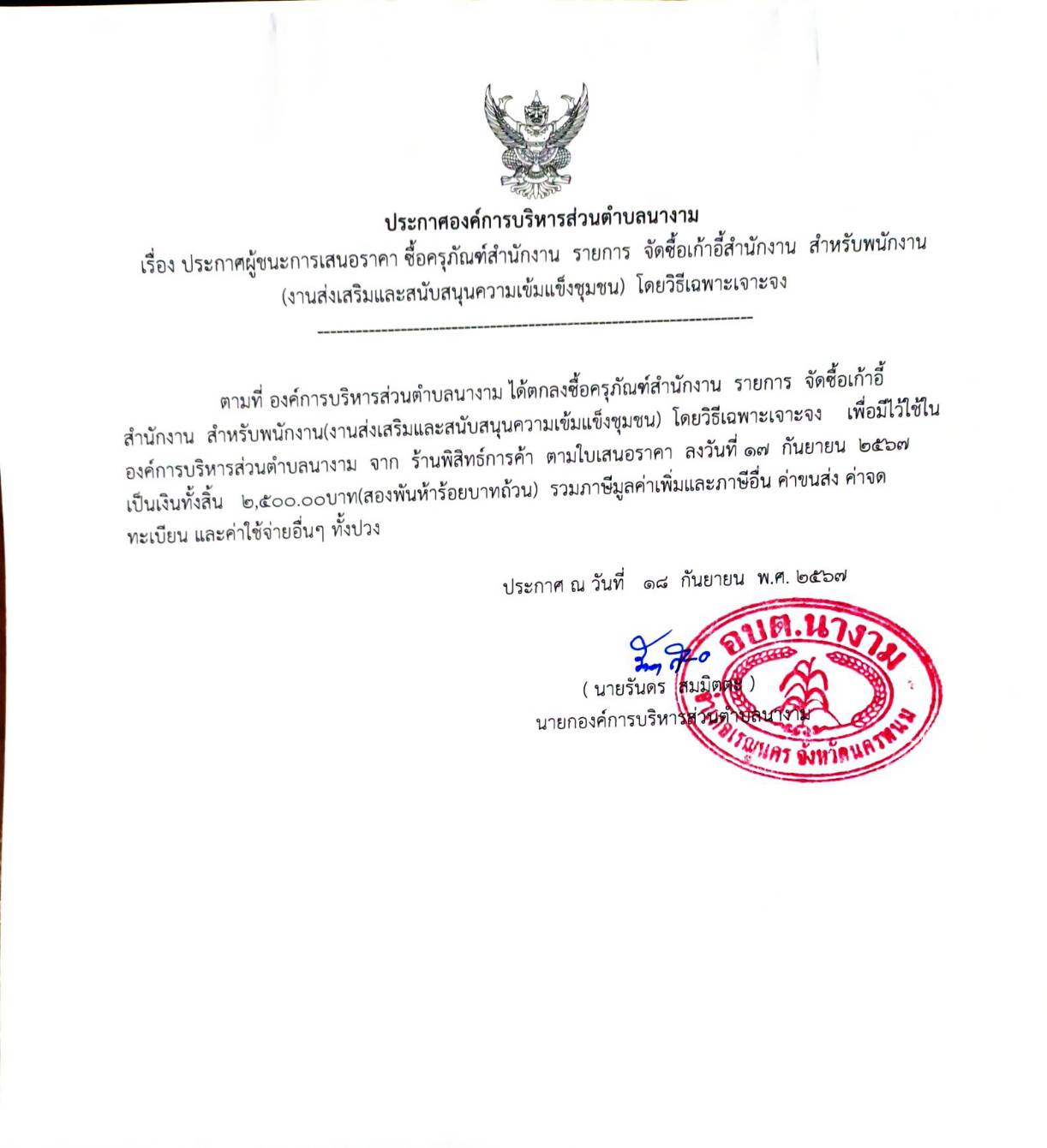 ประกาศผู้ชนะการเสนอราคา ซื้อครุภัณฑ์สำนักงาน รายการ จัดซื้อเก้าอี้สำนักงาน สำหรับพนักงาน(งานส่งเสริมและสนับสนุนความเข้มแข็งชุมชน) โดยวิธีเฉพาะเจาะจง