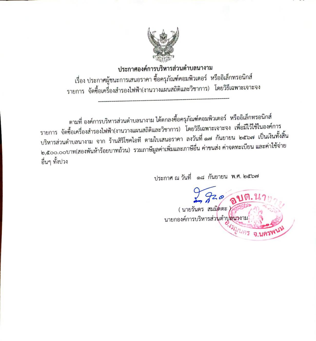 ประกาศผู้ชนะการเสนอราคา ซื้อครุภัณฑ์คอมพิวเตอร์ หรืออิเล็กทรอนิกส์ รายการ จัดซื้อเครื่องสำรองไฟฟ้า(งานวางแผนสถิติและวิชาการ) โดยวิธีเฉพาะเจาะจง