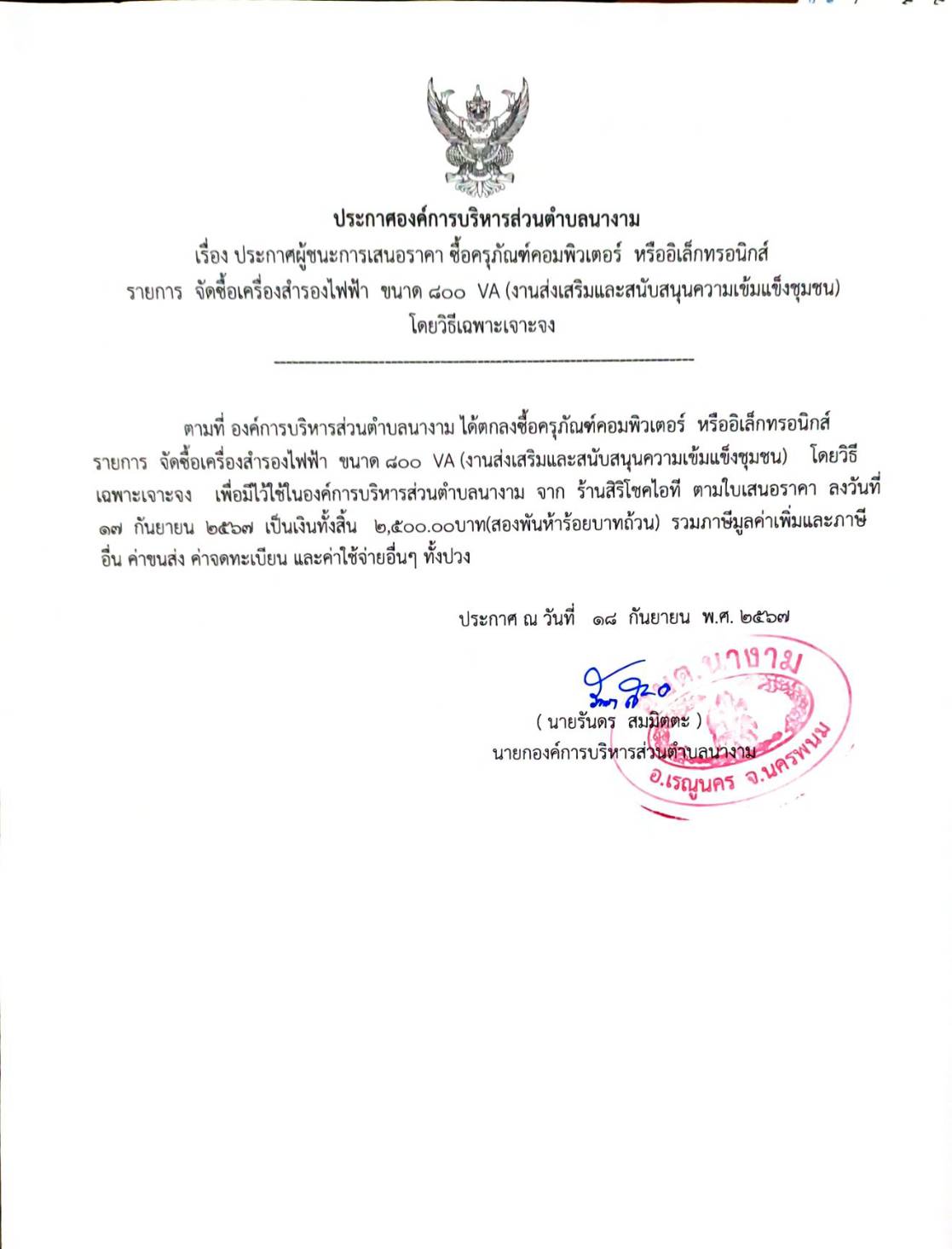 ประกาศผู้ชนะการเสนอราคา ซื้อครุภัณฑ์คอมพิวเตอร์ หรืออิเล็กทรอนิกส์ รายการ จัดซื้อเครื่องสำรองไฟฟ้า ขนาด 800 VA(งานส่งเสริมและสนับสนุนความเข้มแข็งชุมชน) โดยวิธีเฉพาะเจาะจง
