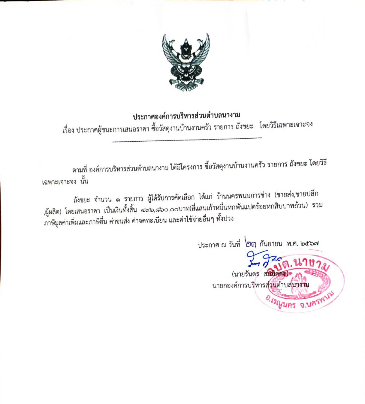 ชื่อเรื่อง : ประกาศผู้ชนะการเสนอราคา ซื้อวัสดุงานบ้านงานครัว รายการ ถังขยะ โดยวิธีเฉพาะเจาะจง