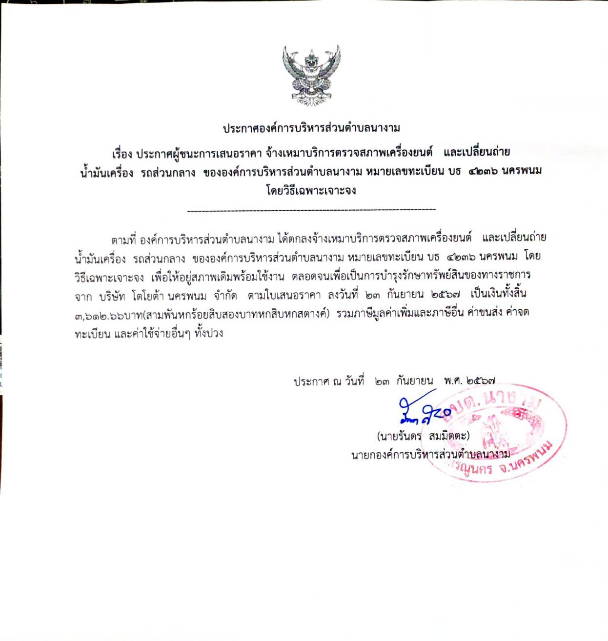 ชื่อเรื่อง : ประกาศผู้ชนะการเสนอราคา จ้างเหมาบริการตรวจสภาพเครื่องยนต์ และเปลี่ยนถ่ายน้ำมันเครื่อง รถส่วนกลาง ขององค์การบริหารส่วนตำบลนางาม หมานเลขทะเบียน บธ ๔๒๓๖ นครพนม โดยวิธีเฉพาะเจาะจง