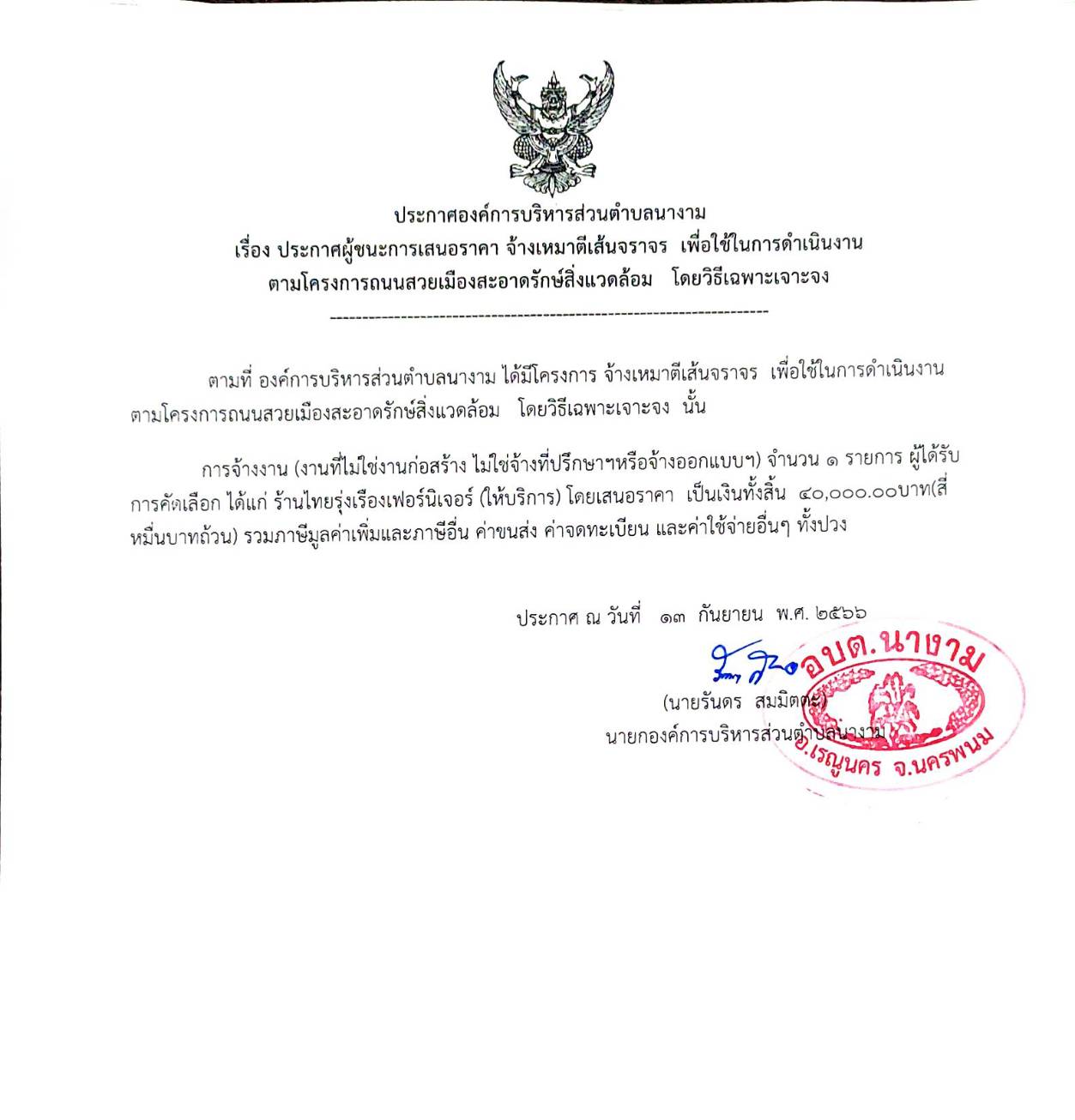 ชื่อเรื่อง : ประกาศผู้ชนะการเสนอราคา จ้างเหมาตีเส้นจราจร เพื่อใช้ในการดำเนินงานตามโครงการถนนสวยเมืองสะอาดรักษ์สิ่งแวดล้อม โดยวิธีเฉพาะเจาะจง