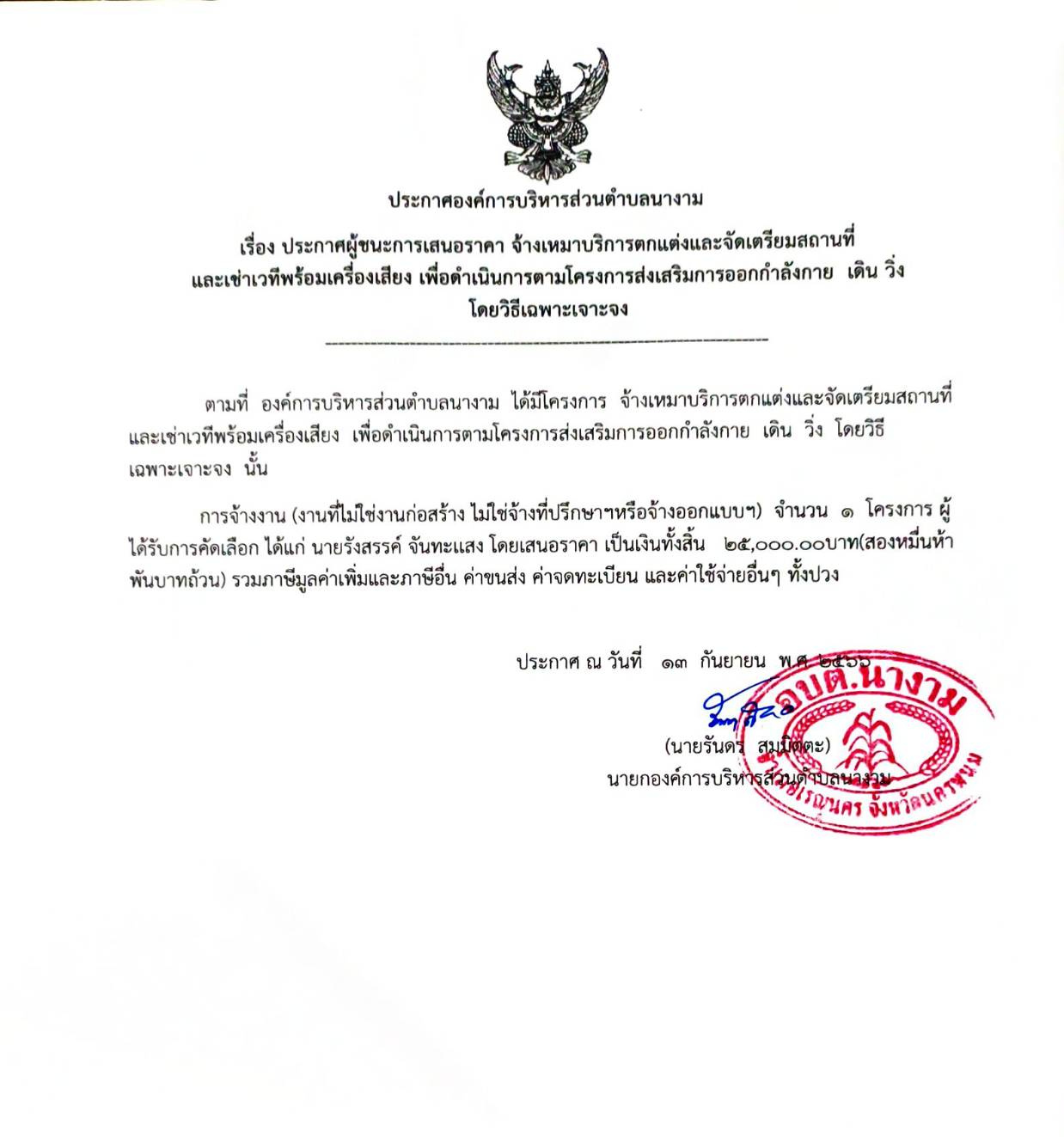 ประกาศผู้ชนะการเสนอราคา จ้างเหมาบริการตกแต่งและจัดเตรียมสถานที่ และเช่าเวทีพร้อมเครื่องเสียง เพื่อดำเนินการตามโครงการส่งเสริมการออกกำลังกาย เดิน วิ่ง โดยวิธีเฉพาะเจาะจง