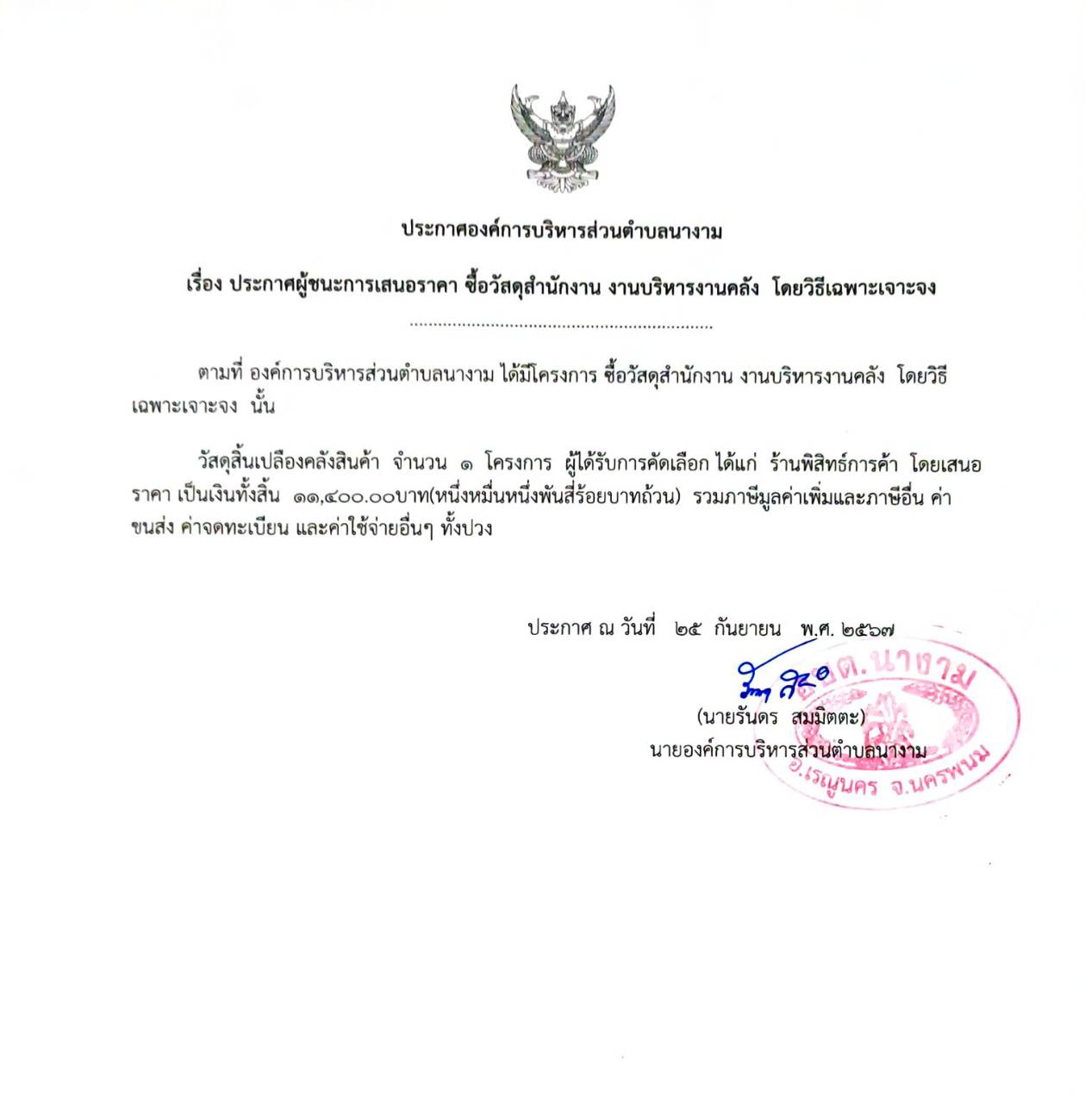 ประกาศผู้ชนะการเสนอราคา ซื้อวัสดุสำนักงาน งานบริหารงานคลัง โดยวิธีเฉพาะเจาะจง
