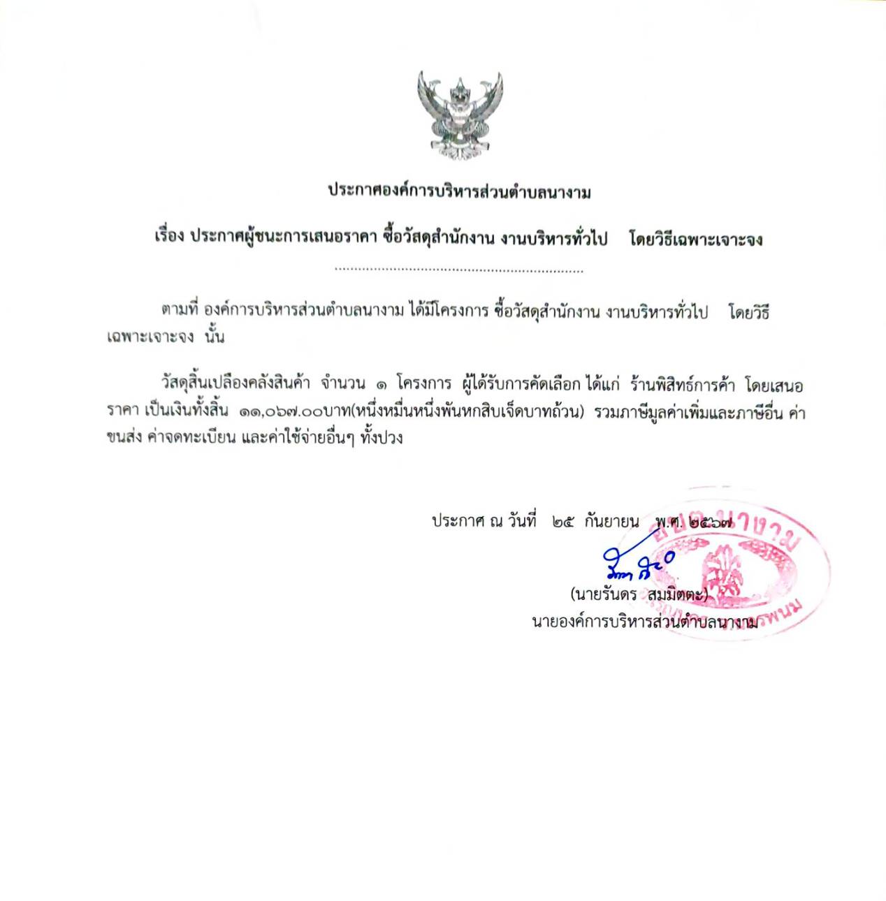 ประกาศผู้ชนะการเสนอราคา ซื้อวัสดุสำนักงาน งานบริหารทั่วไป โดยวิธีเฉพาะเจาะจง