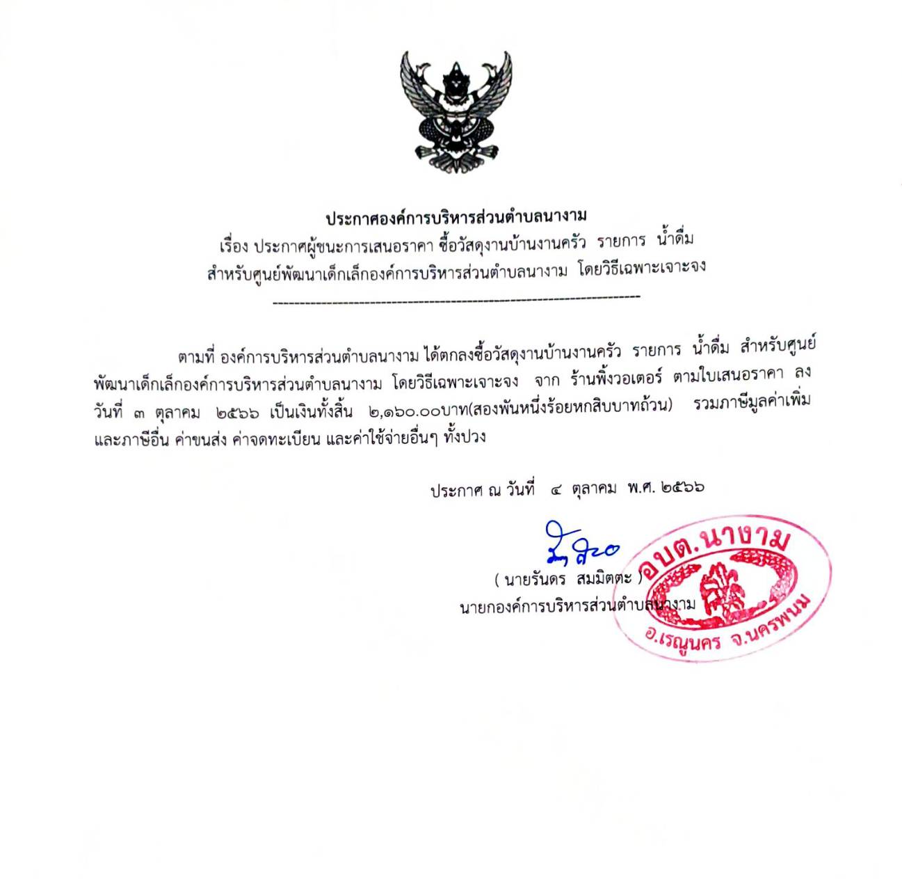 ชื่อเรื่อง : ประกาศผู้ชนะการเสนอราคา ซื้อวัสดุงานบ้านงานครัว รายการ น้ำดื่ม สำหรับศูนย์พัฒนาเด็กเล็กองค์การบริหารส่วนตำบลนางาม โดยวิธีเฉพาะเจาะจง