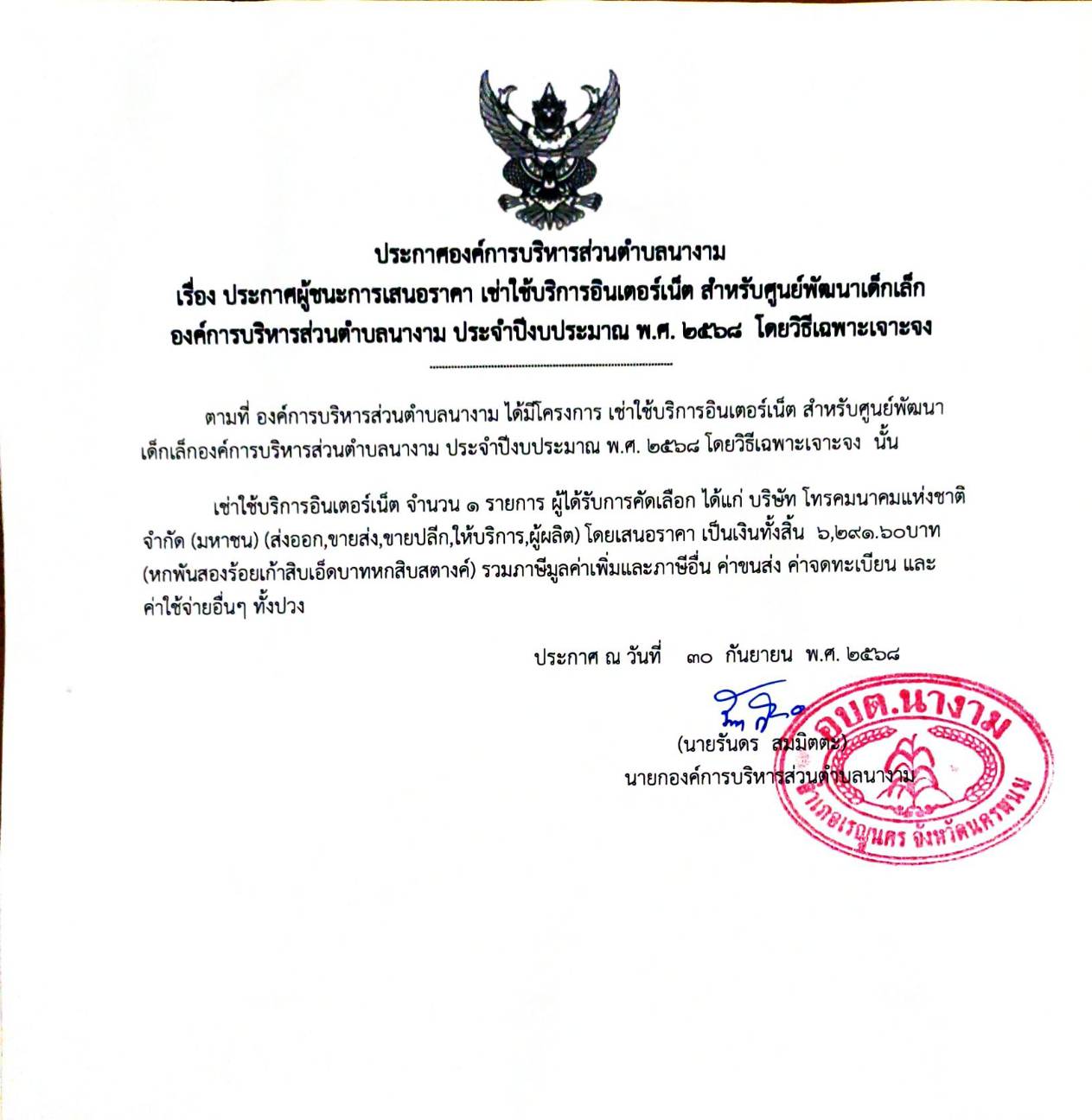 ประกาศผู้ชนะการเสนอราคา เช่าใช้บริการอินเตอร์เน็ต สำหรับศูนย์พัฒนาเด็กเล็กองค์การบริหารส่วนตำบลนางาม ประจำปีงบประมาณ พ.ศ. ๒๕๖๘ โดยวิธีเฉพาะเจาะจง