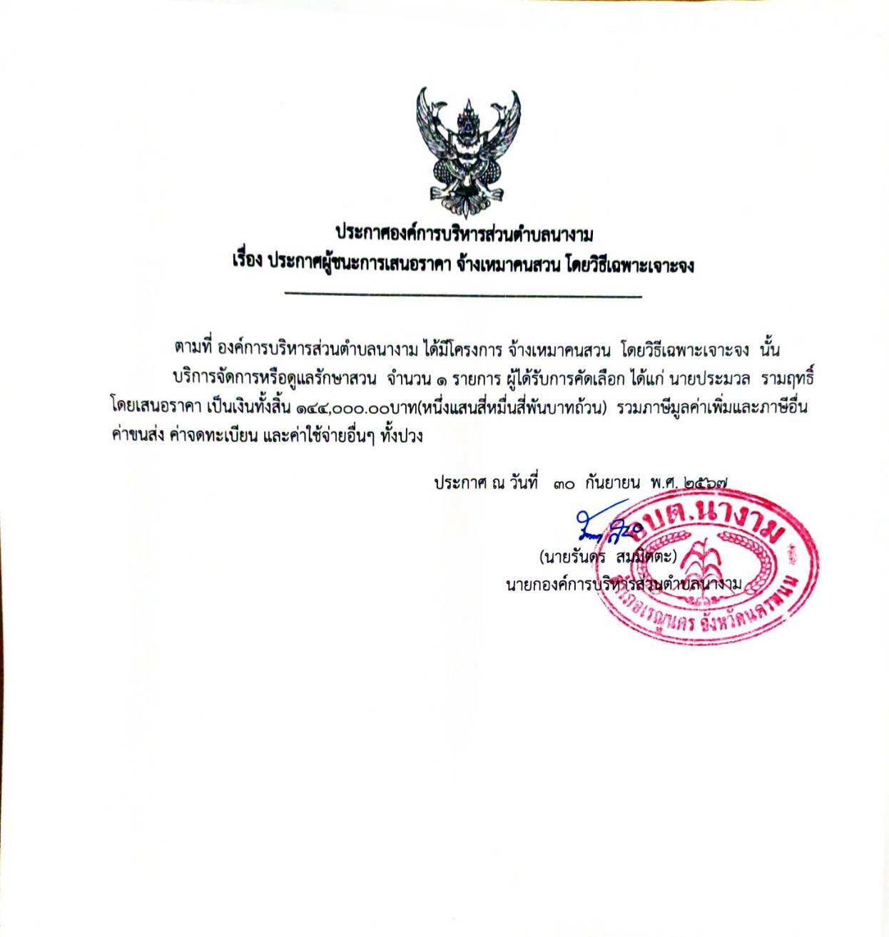ประกาศผู้ชนะการเสนอราคา จ้างเหมาคนสวน โดยวิธีเฉพาะเจาะจง