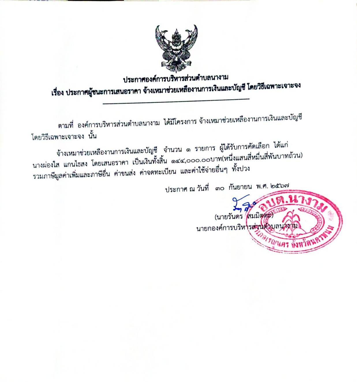 ประกาศผู้ชนะการเสนอราคา จ้างเหมาช่วยเหลืองานการเงินและบัญชี โดยวิธีเฉพาะเจาะจง