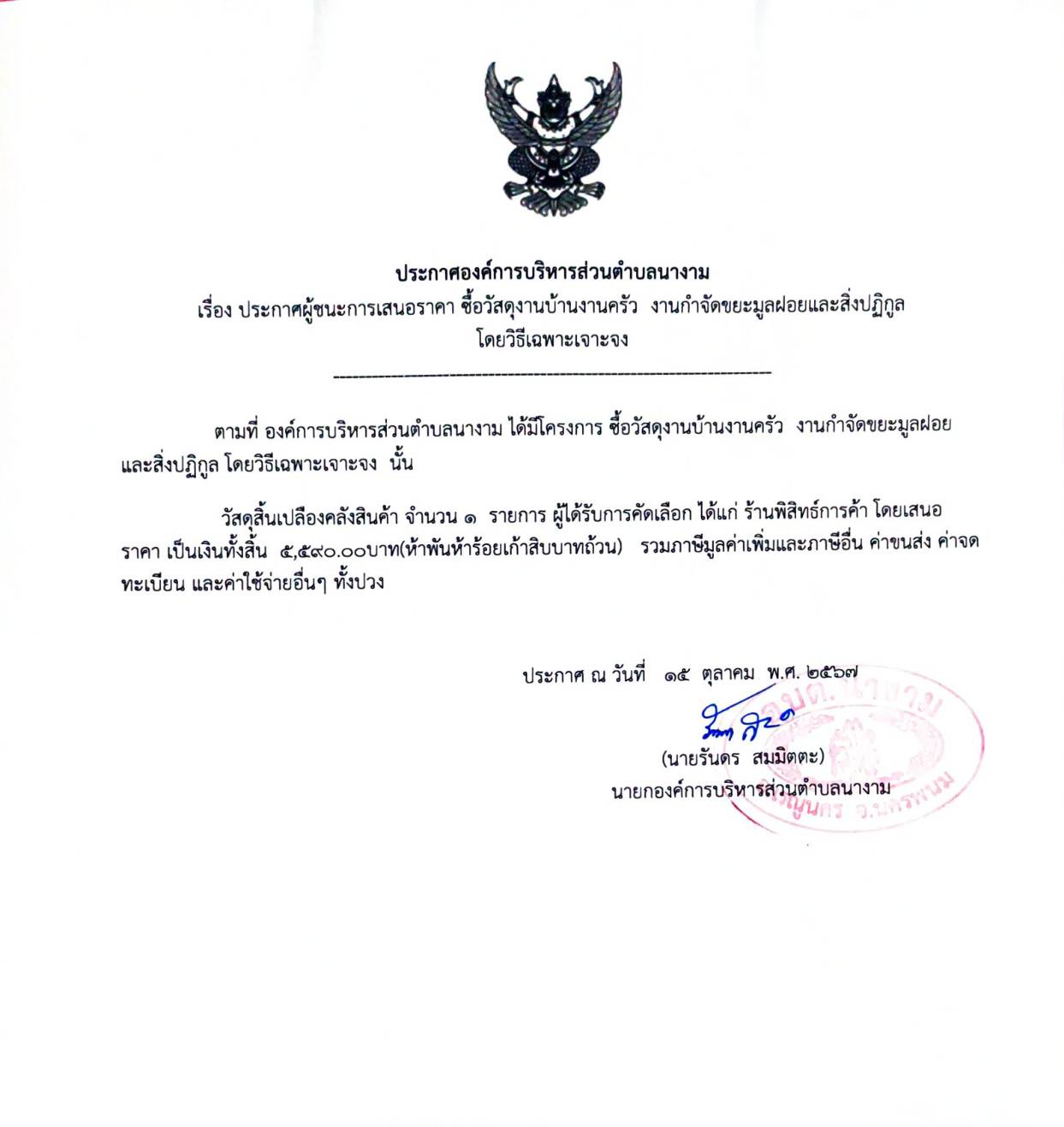 ชื่อเรื่อง : ประกาศผู้ชนะการเสนอราคา ซื้อวัสดุงานบ้านงานครัว งานกำจัดขยะมูลฝอยและสิ่ง ปฏิกูล โดยวิธีเฉพาะเจาะจง