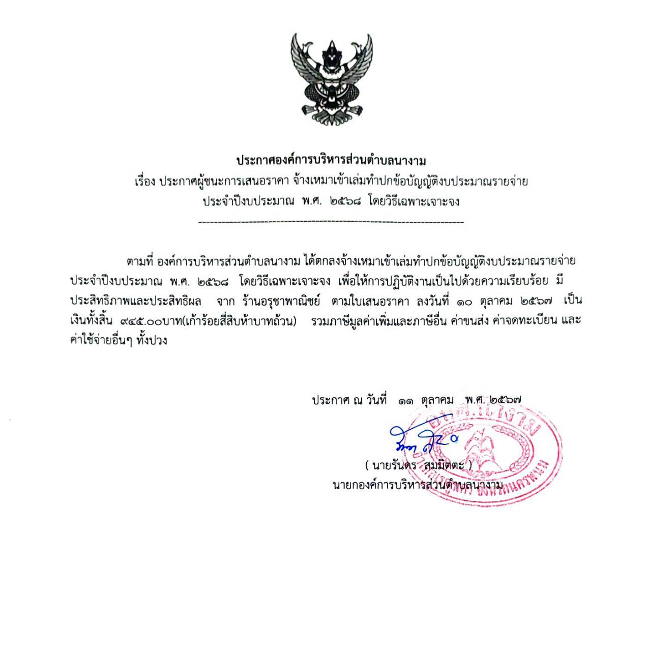 ประกาศผู้ชนะการเสนอราคา จ้างเหมาเข้าเล่มทำปกข้อบัญญัติงบประมาณรายจ่าย ประจำปีงบประมาณ พ.ศ. ๒๕๖๘ โดยวิธีเฉพาะเจาะจง
