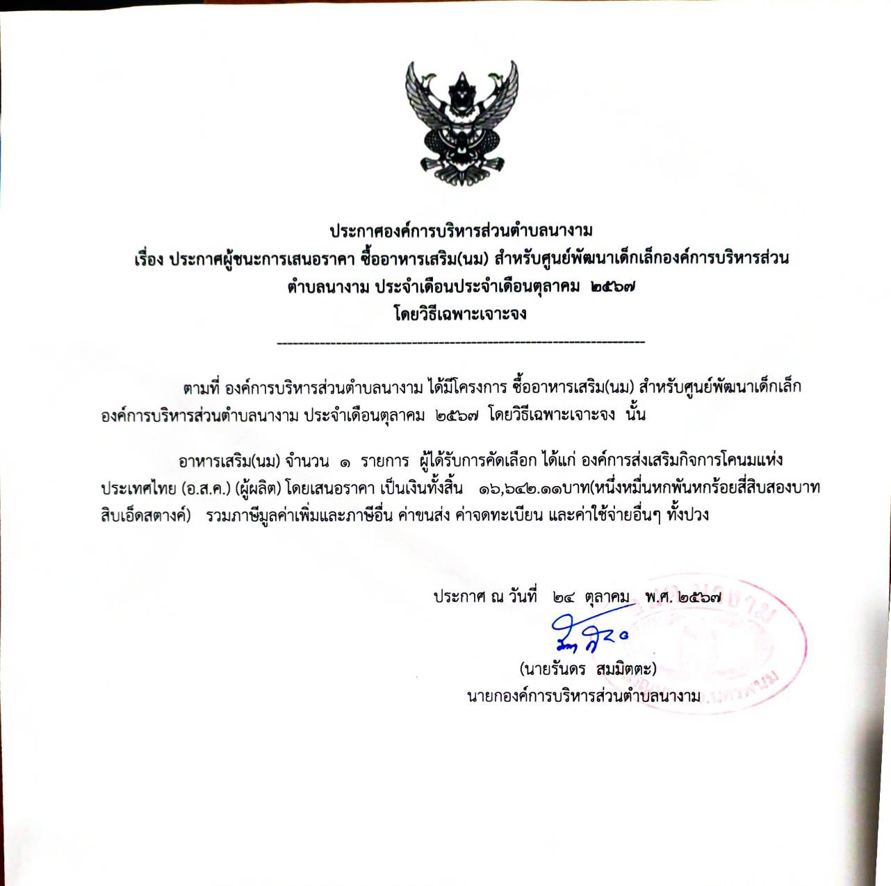 ประกาศผู้ชนะการเสนอราคา ซื้ออาหารเสริม(นม) สำหรับศูนย์พัฒนาเด็กเล็กองค์การบริหารส่วนตำบลนางาม ประจำเดือนตุลาคม ๒๕๖๗ โดยวิธีเฉพาะเจาะจง