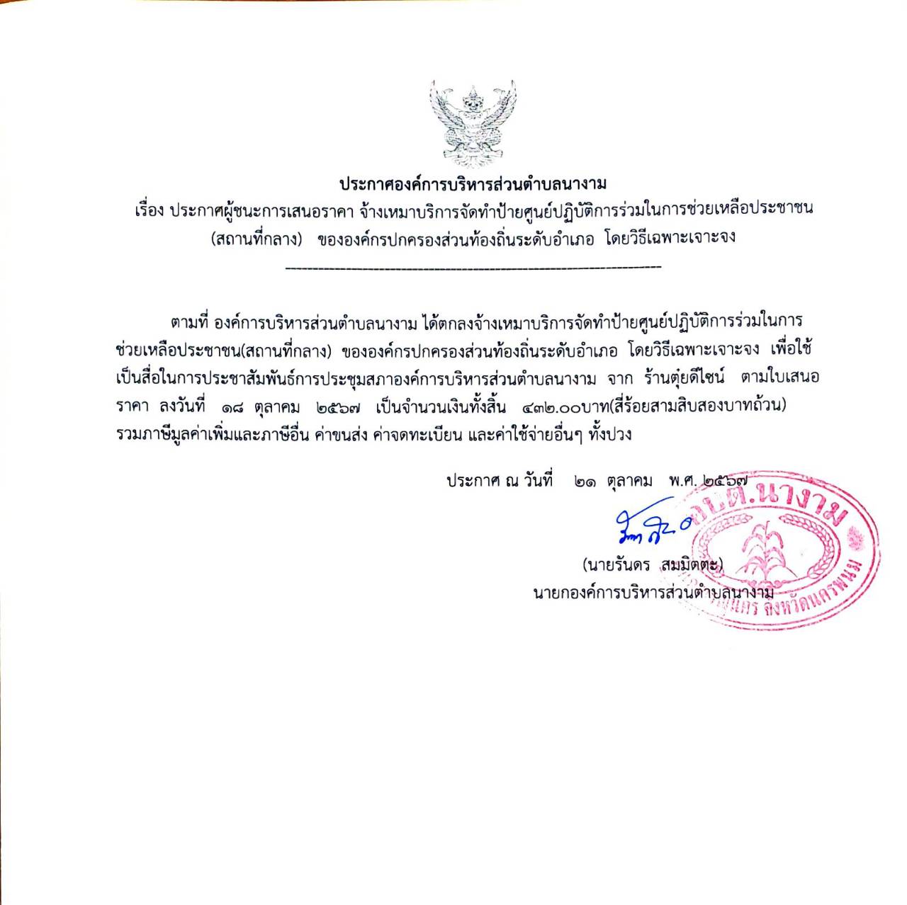 ชื่อเรื่อง : ประกาศผู้ชนะการเสนอราคา จ้างเหมาบริการจัดทำป้ายศูนย์ปฏิบัติการร่วมในการช่วยเหลือประชาชน(สถานที่กลาง) ขององค์กรปกครองส่วนท้องถิ่นระดับอำเภอ โดยวิธีเฉพาะเจาะจง